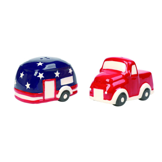 Americana Stars & Striped Old Fashioned Truck & Camper Dolomite Stoneware Salt & Pepper Shaker Set