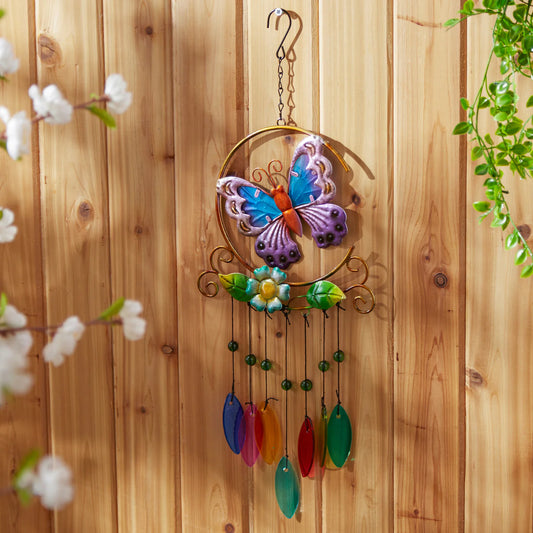 Glass Leaves Wind Chime - Butterfly Iron Ornament