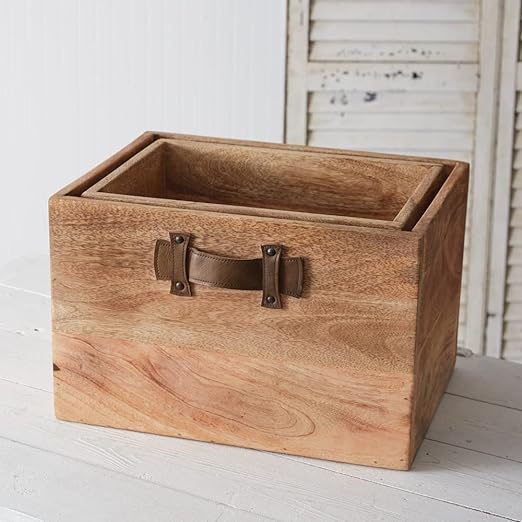 Set of Two Leather Handled Wood Boxes
