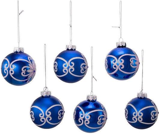 Shiny And Matte Blue Flowers Glass Ball- 6 Piece Boxed Ornament