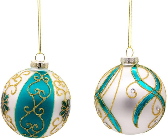 Dark Teal And White Embellished Ball- 6 Piece Ornament Set