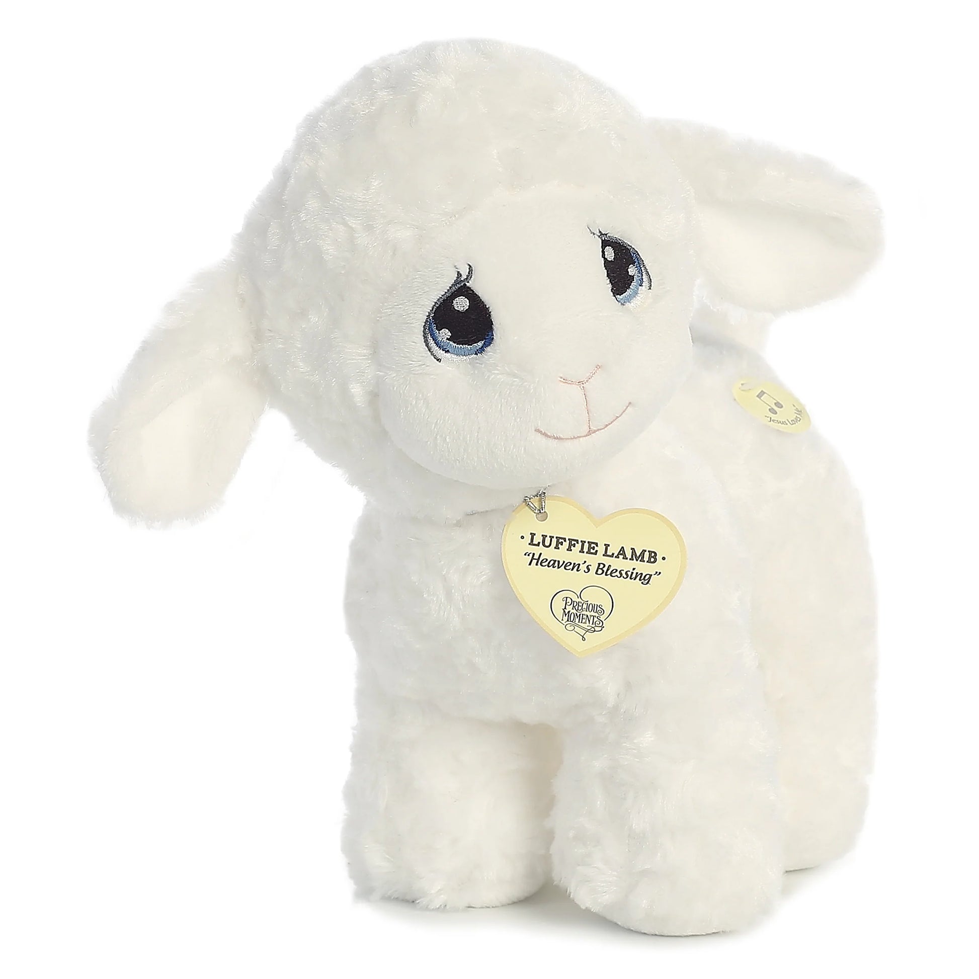 - Each Precious Moments plush comes with an inspirational saying on a heart-shaped tag