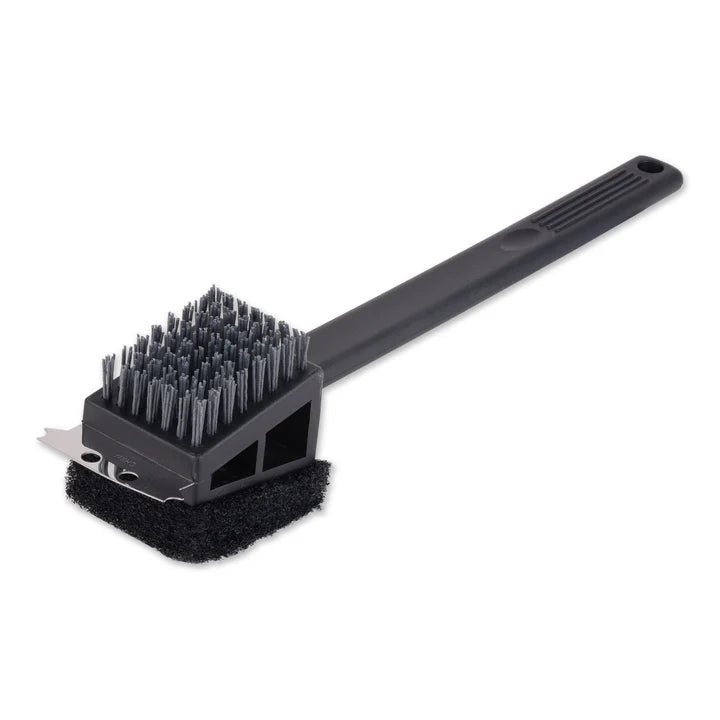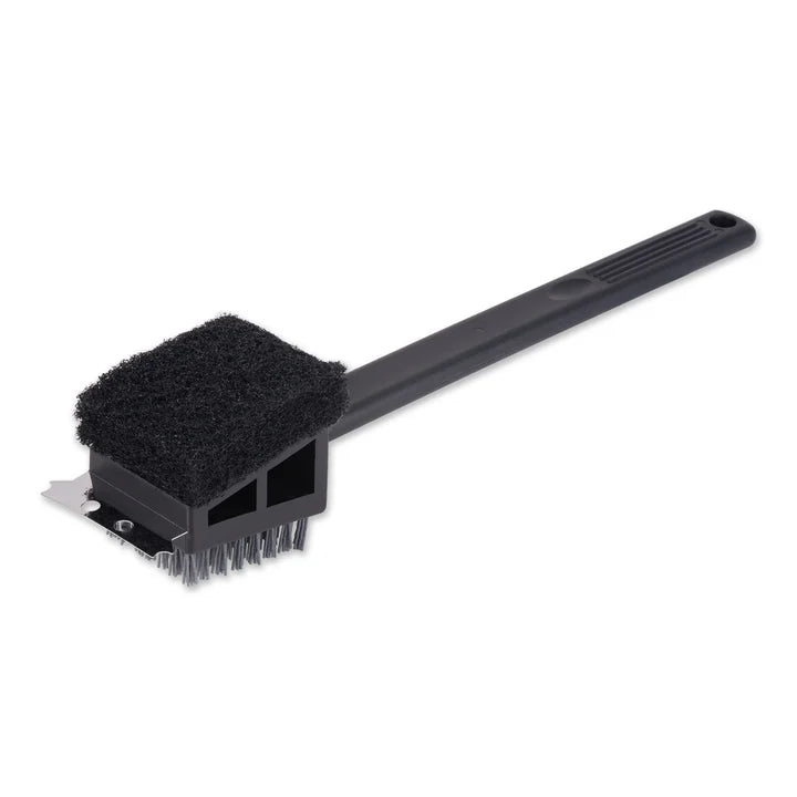 3 in 1 action brush scours, scrapes, and cleans grill grates with a single tool.