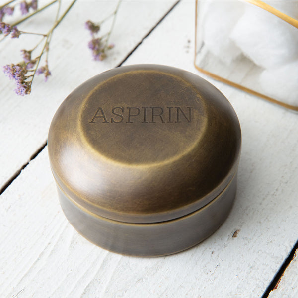 Place this antique brass pill box on your counter for a vintage look and place small trinkets inside. This box is made of metal and reads aspirin on its top. The item is not intended to place actual medication inside.