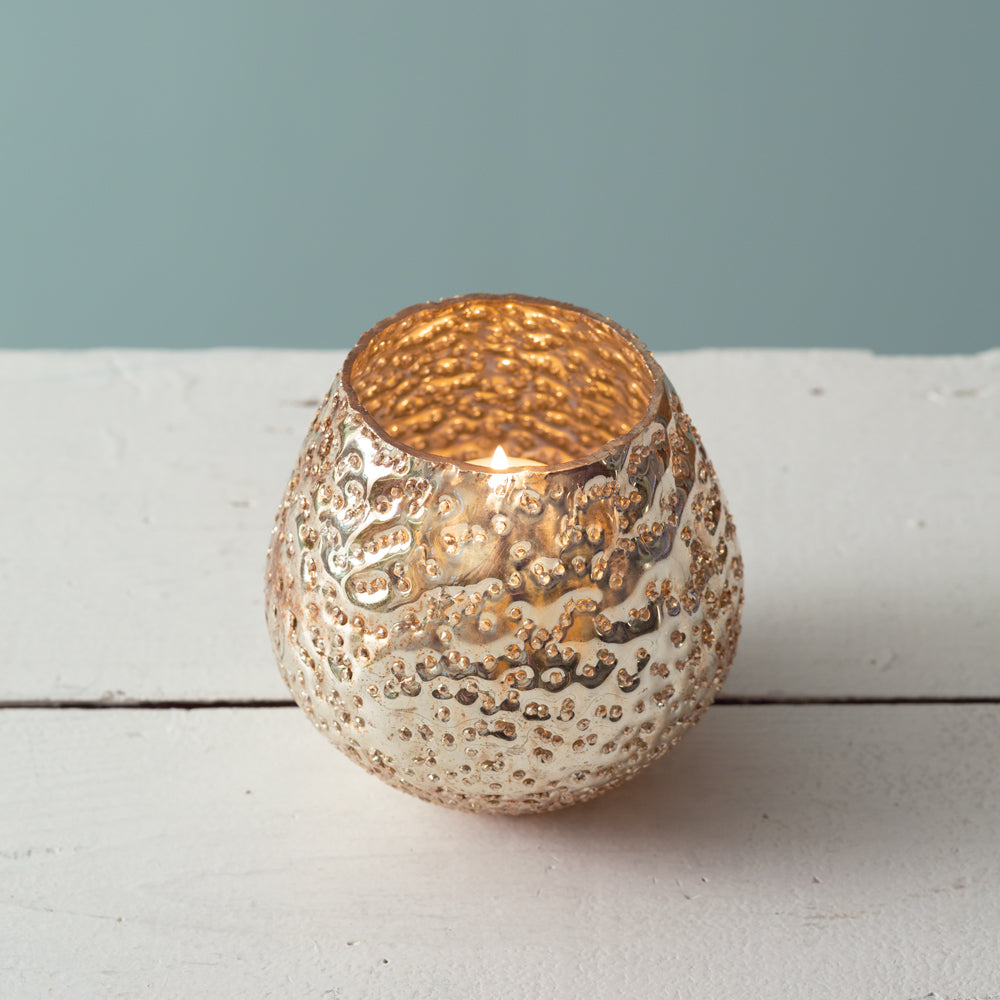 This shimmering votive holder is a great way to add some sparkle into your home! It has lots of texture on its outside on gold mercury glass, making it distinctively unique.
