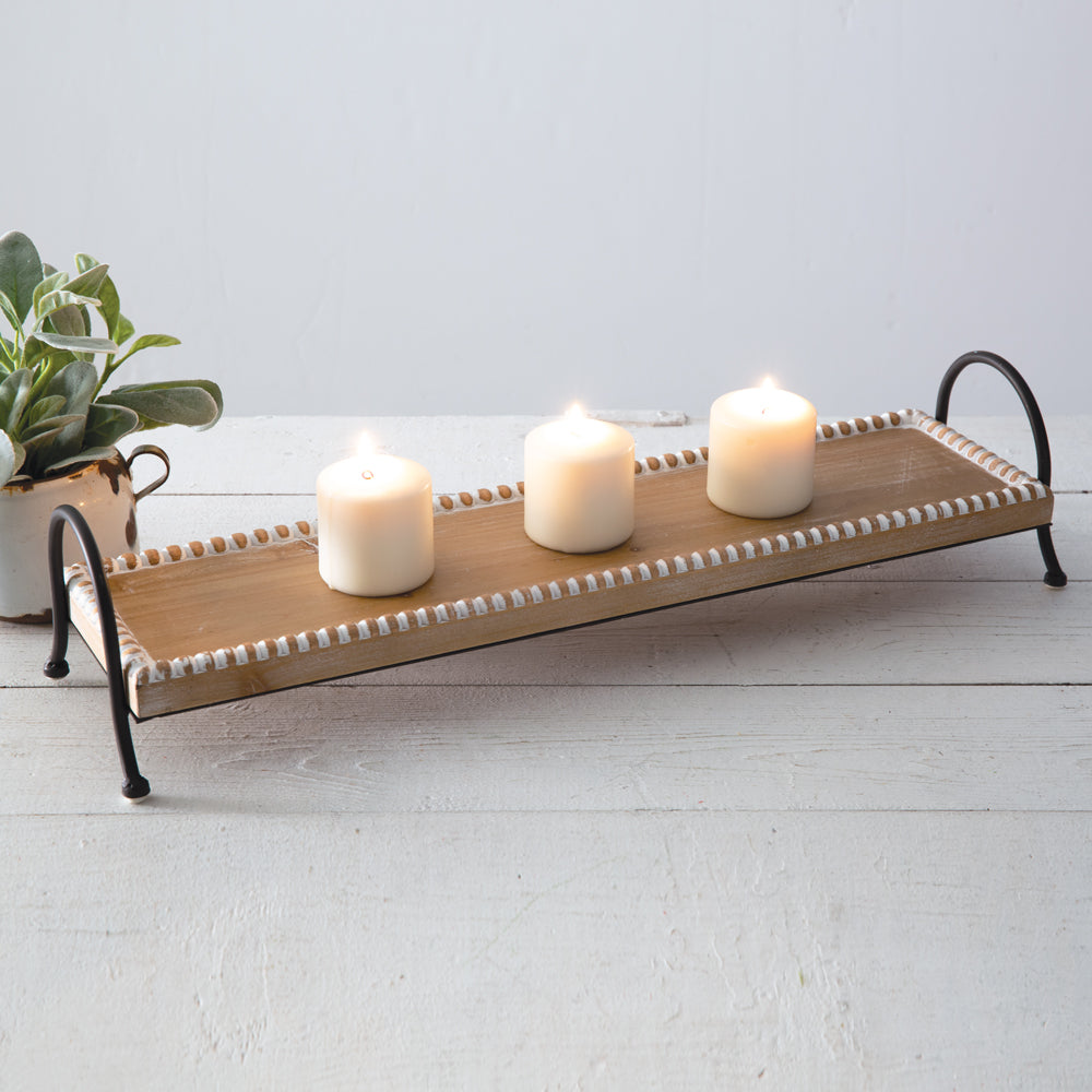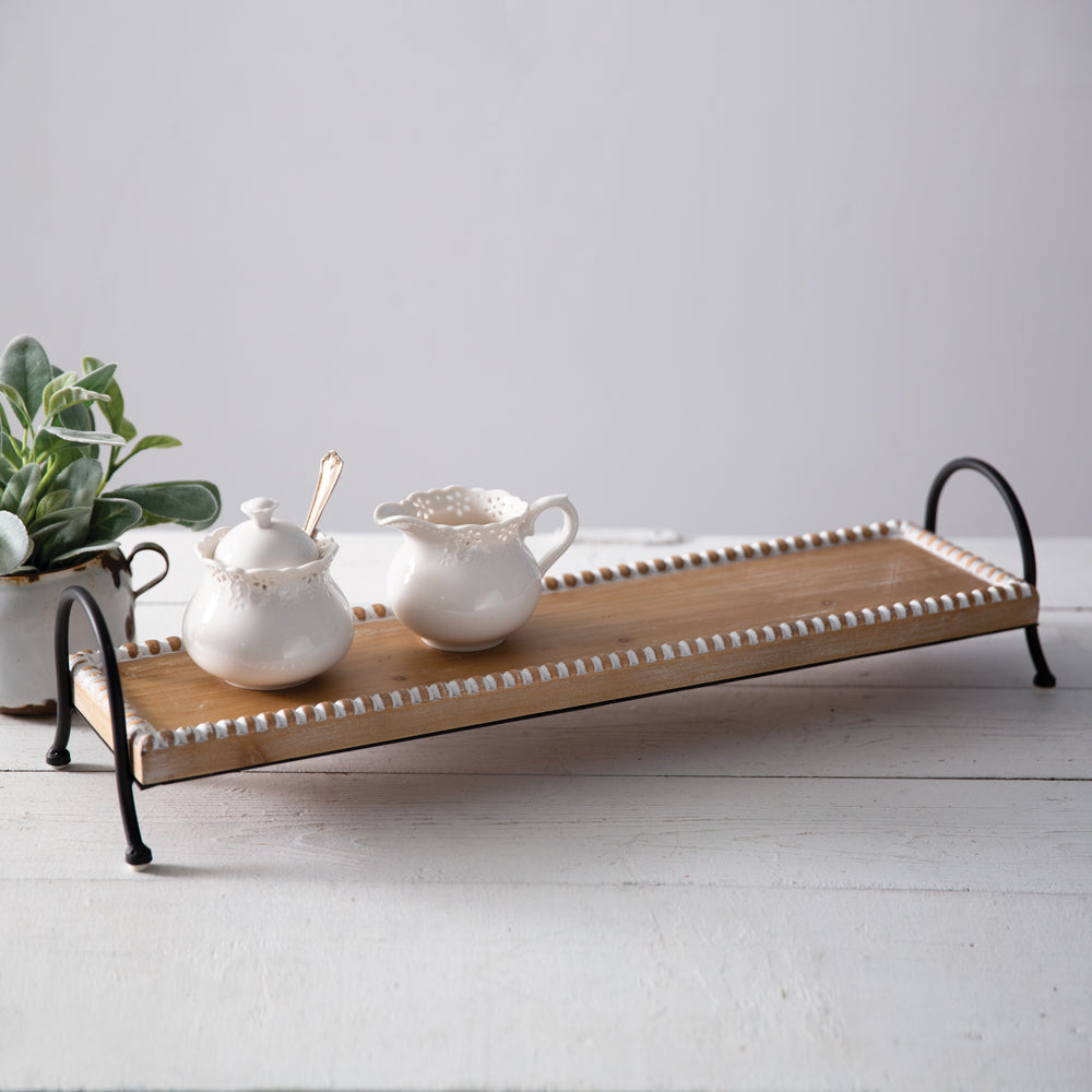 Give your condiments a leg up in the kitchen with this raised wood and metal tray. Perfect for organizing and displaying, this beaded wood tray sits on a sturdy metal frame.