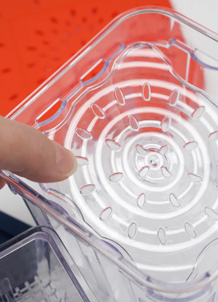 - Containers have raised interior platforms, so that rinsed and drained berries don't sit in water.