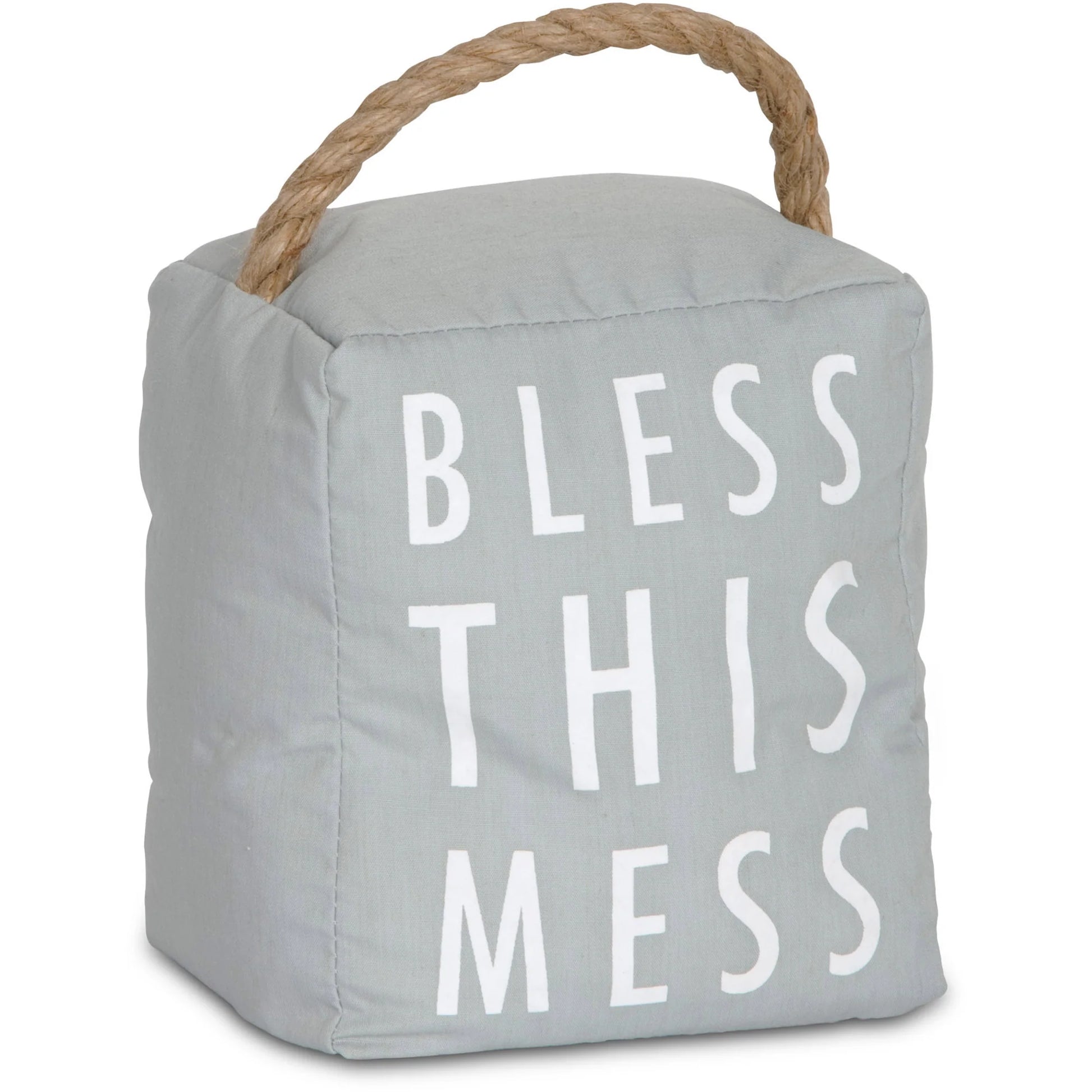 - IN-HOUSE DESIGN: "Bless This Mess" text is printed onto the front of the door stopper.