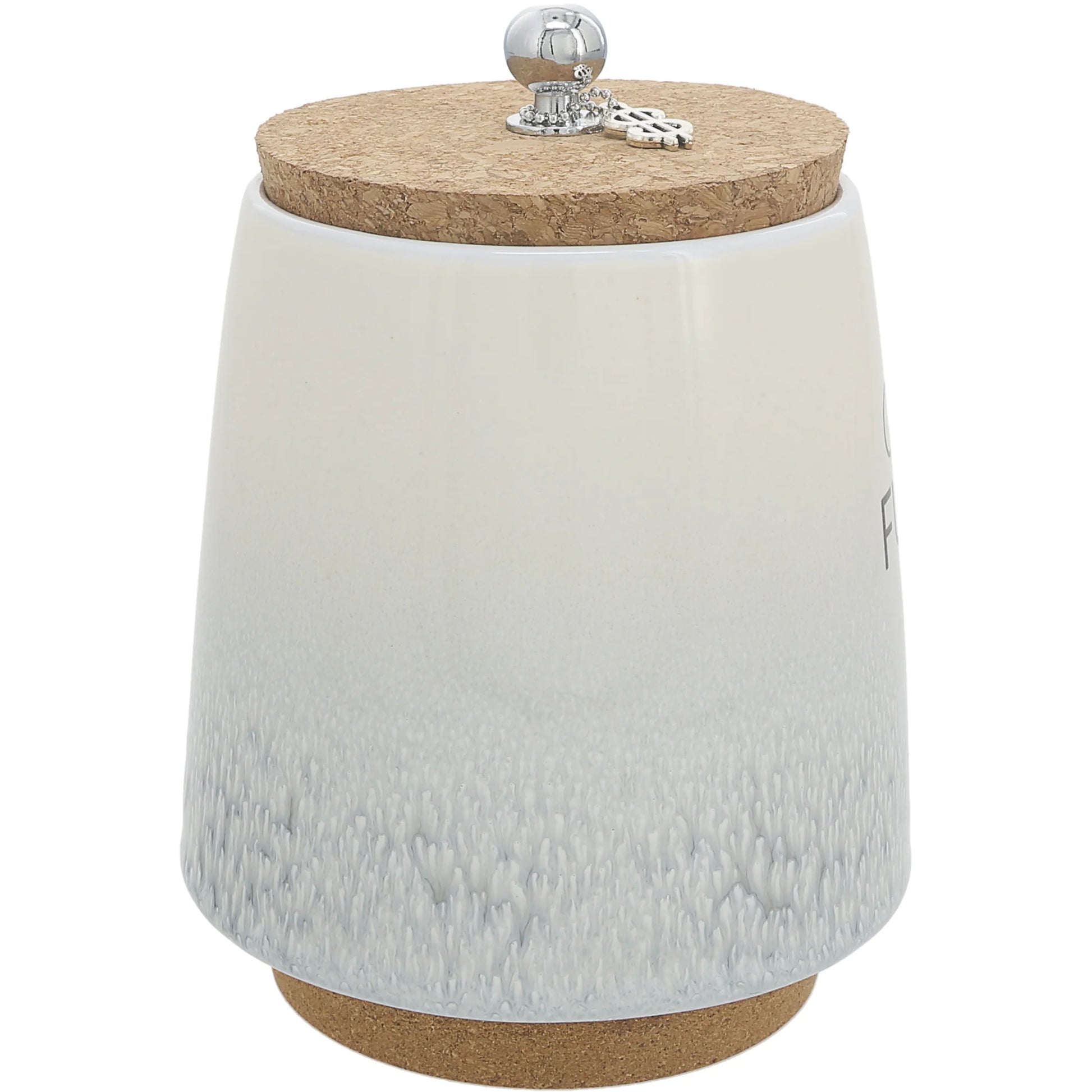 - PREMIUM QUALITY: This incredible money-holding jar is 6.5" tall. The base of the stoneware vessel is 4.5" wide, tapering to 3.5" wide towards the top, where the cork lid narrows from top to bottom to fit snuggly inside the lip of the container. A 1.75" length metal chain holds a removable $ icon keychain that can be added to your keys or left connected to the .5" wide x .75" tall rounded metal ball handle. The base is made from cork to prevent surfaces from scratching and provides an easier grip to pick up the canister.