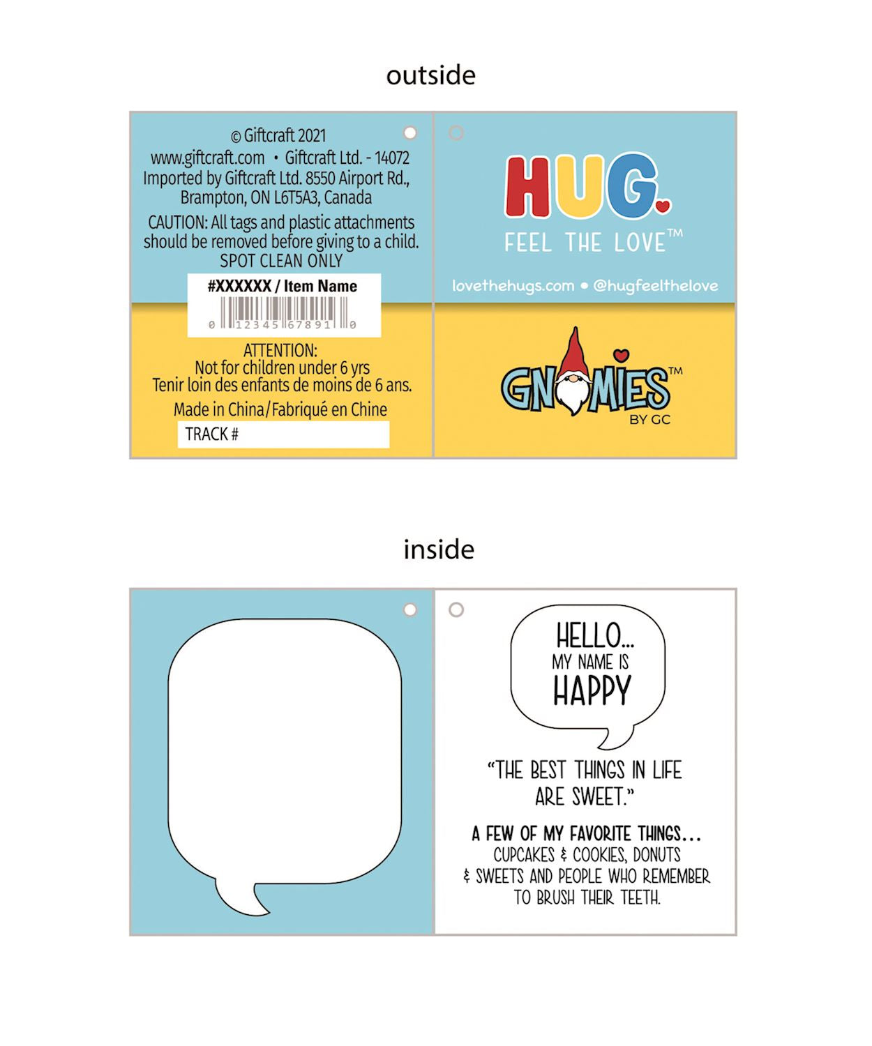 Hello my name is Happy. The best things in life are sweet! A few of my favorite things cupcakes and cookies, donuts and sweets and people who remember to brush their teeth. Share the gift of this pocket-sized plush gnome. Includes a personalized hangtag with their name and charming favorite things personality story. Polyester.