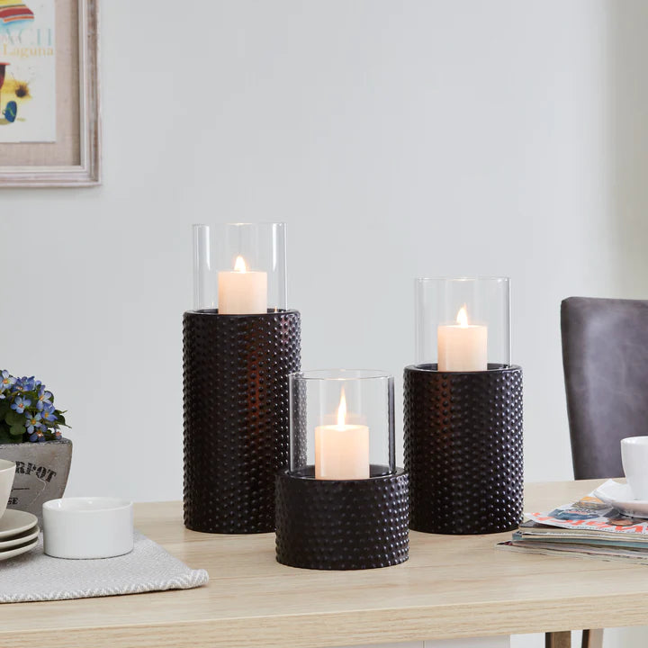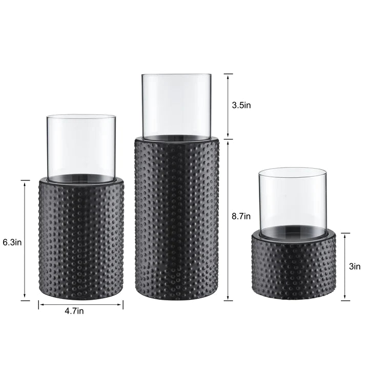 Danya B. Contemporary Candle Holder With Clear Glass Hurricanes And Textured Metal Base