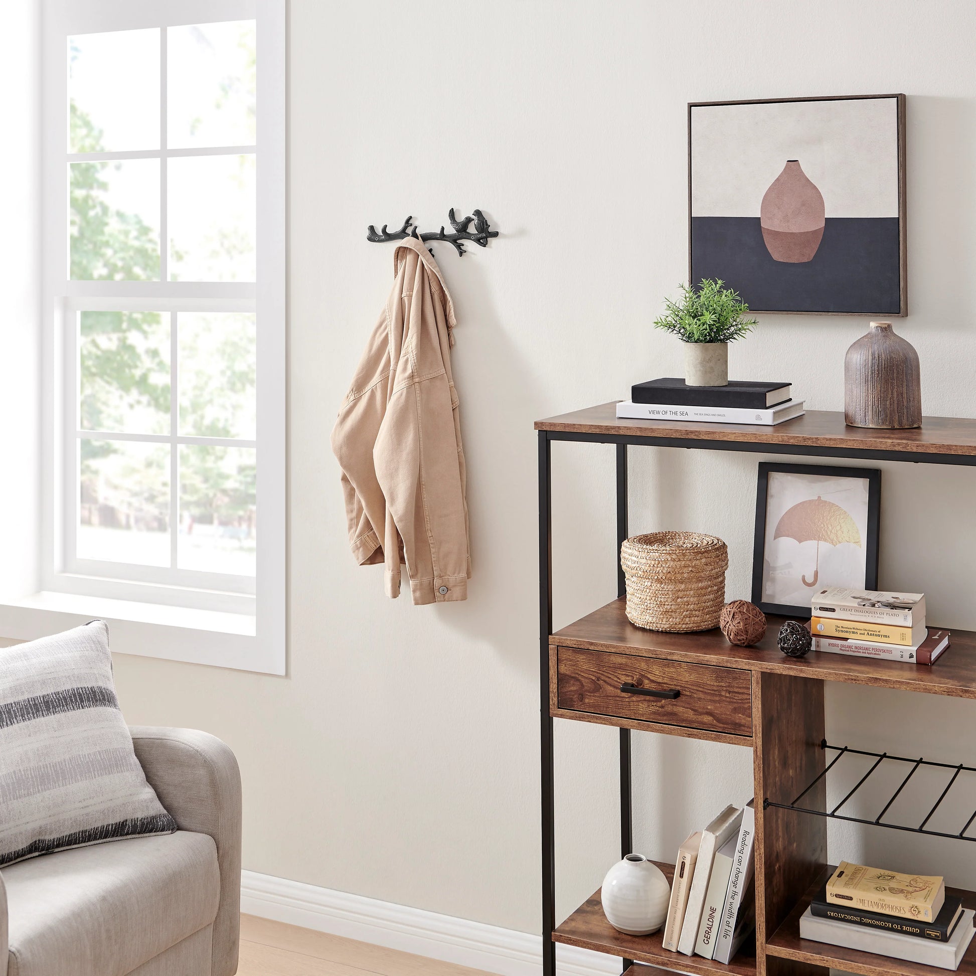 The Danya B. Dark Brown Cast Iron Birds on Branch Wall Hook Sculpture is a charming and functional piece that brings the beauty of nature into your home. Crafted with attention to detail, this decorative wall sculpture features a lifelike tree branch design, complete with intricately sculpted birds perched gracefully along the branch’s length. The four integrated hooks are cleverly disguised as offshoot branches, seamlessly blending practicality with artistic flair. Made from durable cast iron, this wall hook unit is as sturdy as it is stylish, making it perfect for organizing your space while contributing a touch of rustic elegance. The natural design evokes a sense of tranquility, making it an ideal addition to any room, whether you place it in an entryway to hang coats and bags, in the kitchen for utensils, or in the bedroom for accessories. The tree branch and perched birds design adds a whimsical, yet sophisticated touch to your décor, making it a versatile piece that complements a variety of interior styles, from rustic to farmhouse to modern. The thoughtful design and high-quality construction of this sculpted wall hook unit ensures it will be a beloved fixture in your home for years to come. Let the beauty of nature inspire you to stay organized with this delightful and practical Danya B. Dark Brown Cast Iron Birds on Branch Wall Hook Sculpture.