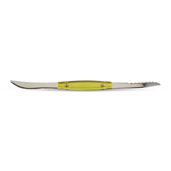 - Handle made of translucent yellow acrylic with 18-8 stainless steel blades.