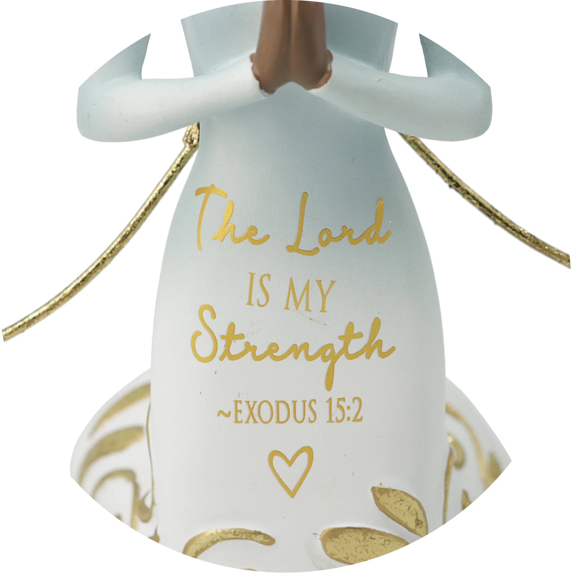 - IN-HOUSE DESIGN: The bottom of the collectible lady figurine has small foam feet to protect furniture surfaces. "The Lord Is My Strength - Exodus 15:2" gold bible verse text and heart decal are printed onto the front her her dress. Her simplistic stature and beautifully detailed face were designed by our in-house team to fit perfectly into any home neutral setting.