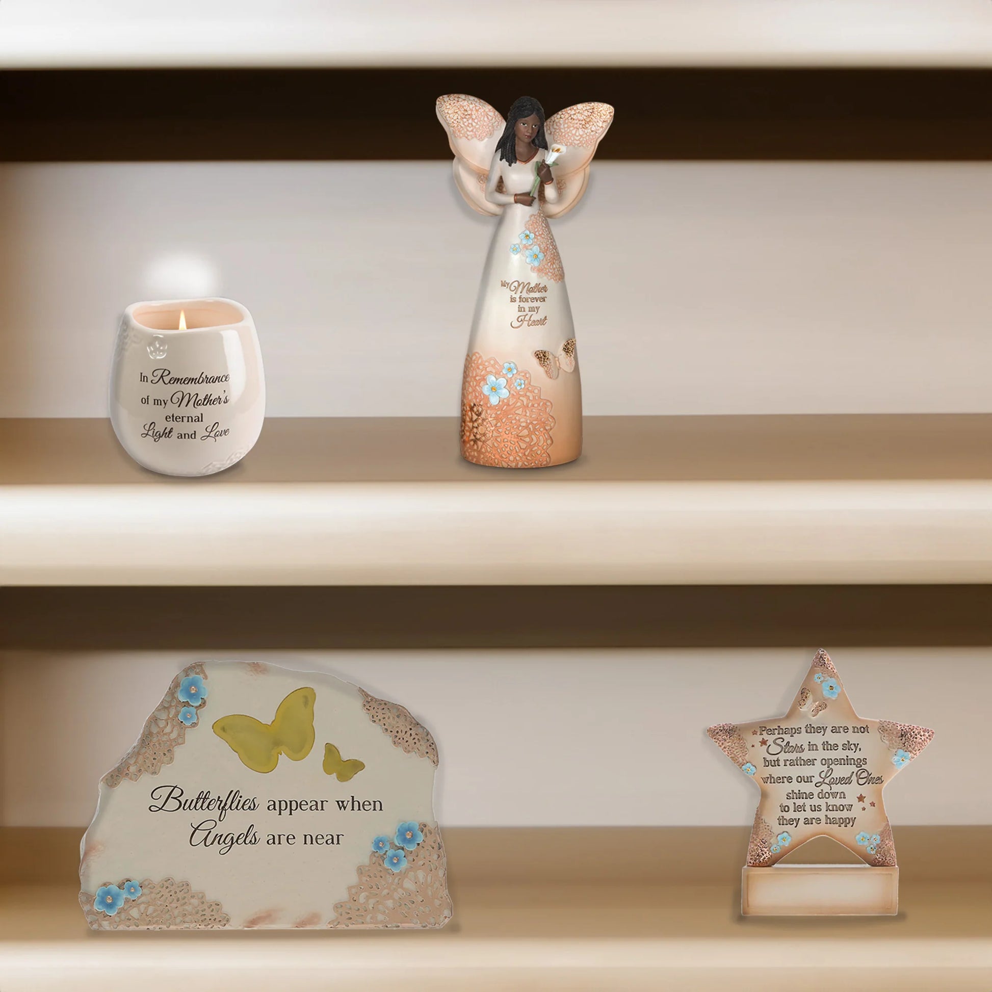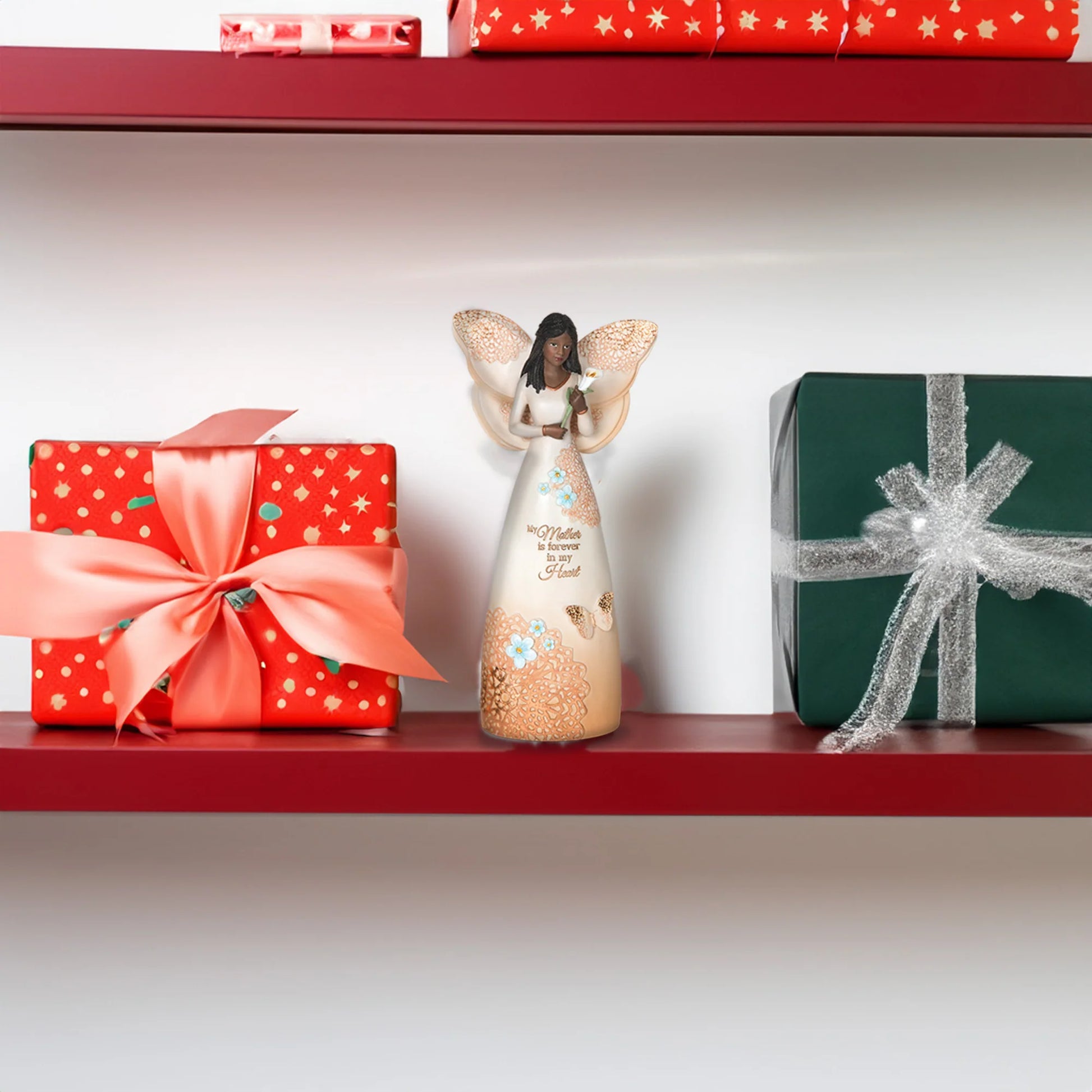 - IN-HOUSE DESIGN: The phrase "My Mother Is Forever In My Heart" is delicately debossed and hand-painted onto the angel’s flowing gown, accompanied by intricate floral patterns and a butterfly design, providing an elegant and serene tribute to a beloved mother.