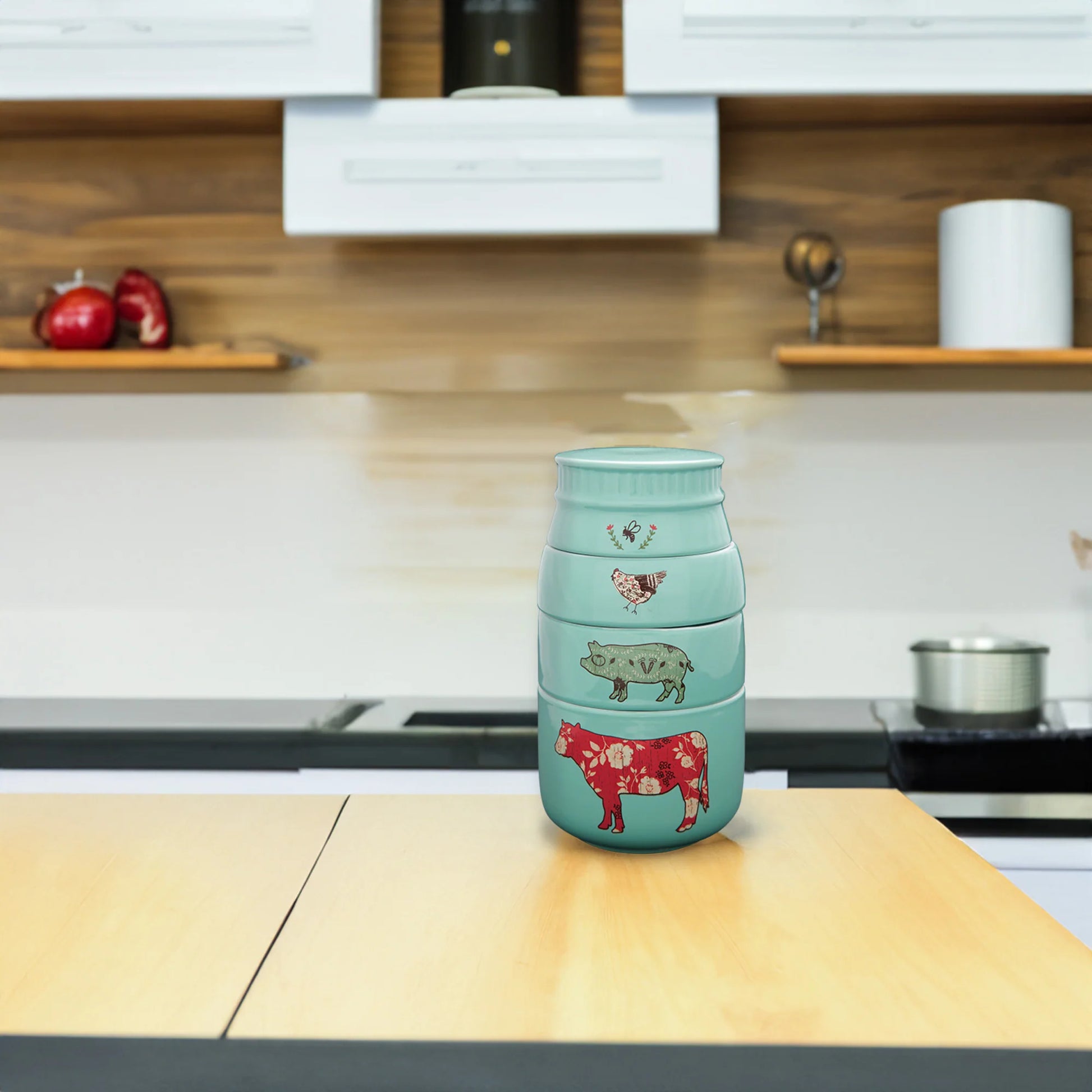 - IN-HOUSE DESIGN: Designed by Amylee Weeks, each cup features charming farm animal illustrations, including a rooster, pig, and cow. The measurements are conveniently printed inside each cup for easy use. The stackable design forms a cohesive display piece that adds farmhouse charm to any kitchen.