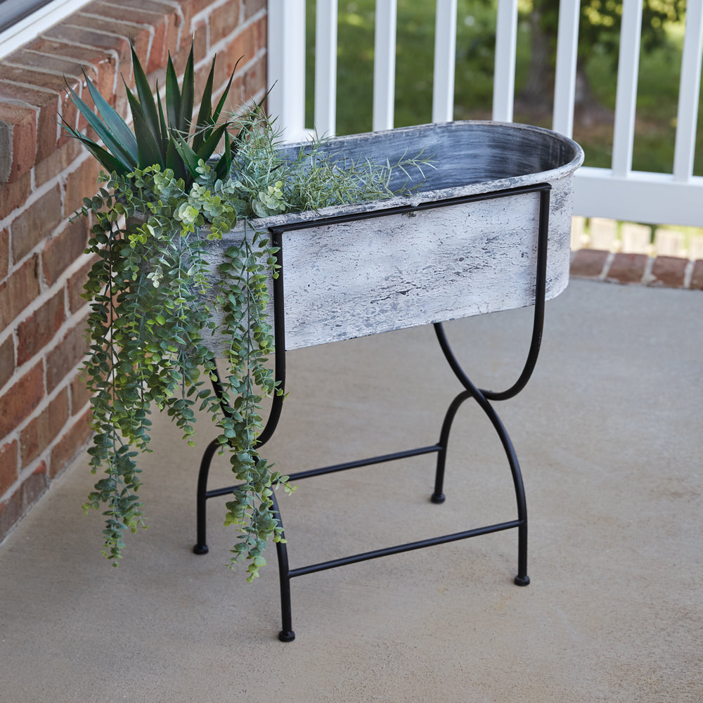 This metal bin will help you create a farmhouse look for your porch or sunroom. Item is made of metal and breaks down for easy storage. Not watertight, use with potted plants.