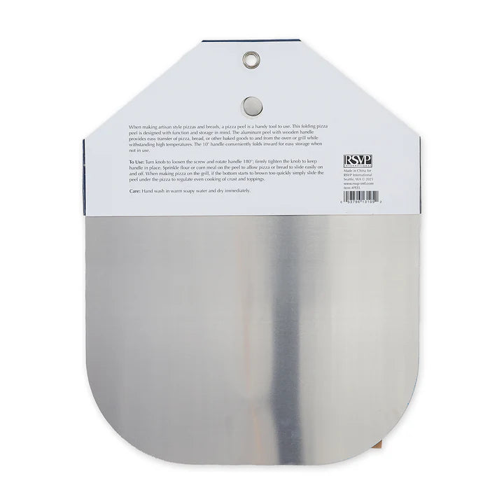 - Aluminum peel with wooden handle provides easy transfer of pizza, bread, or other baked goods.