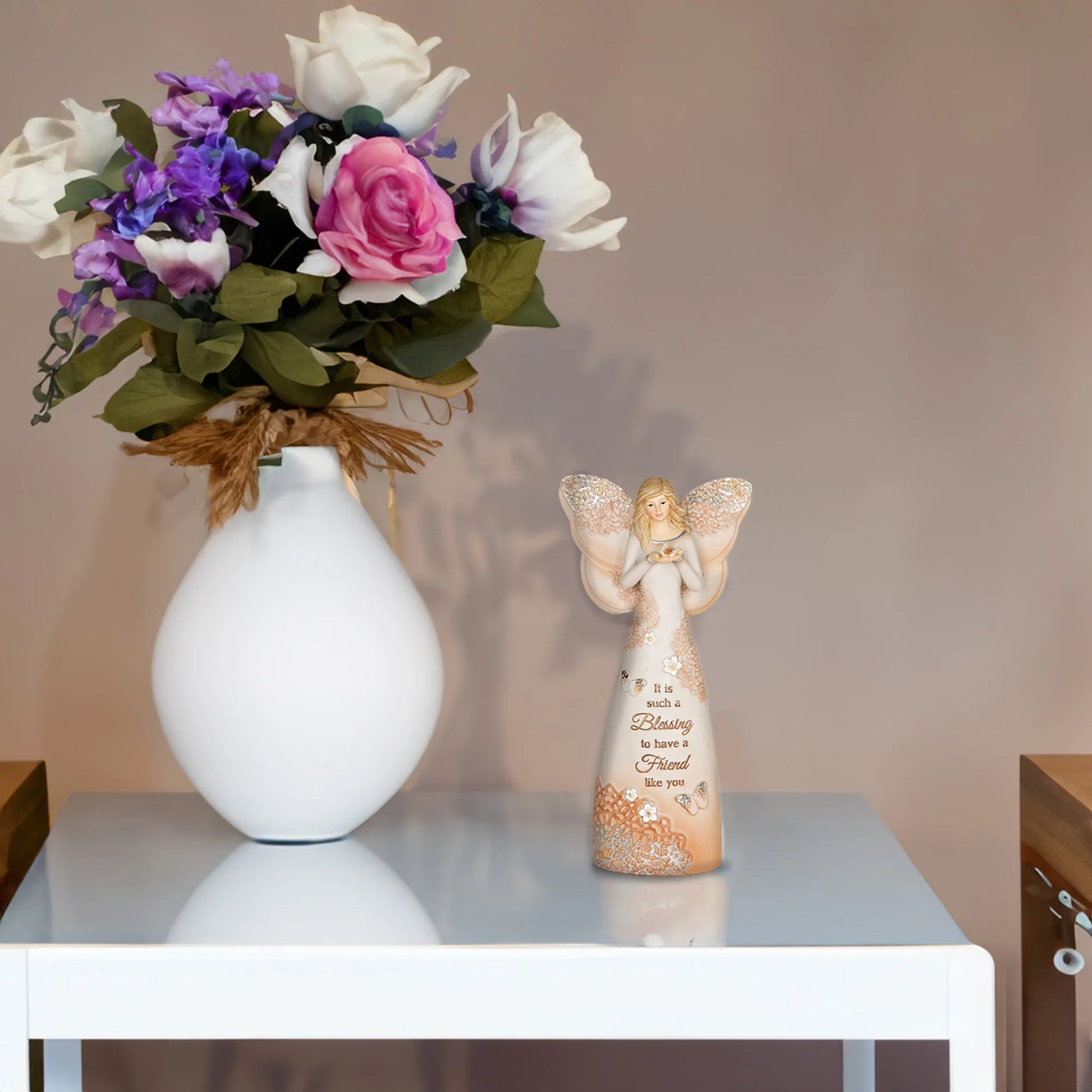 - IN-HOUSE DESIGN: Featuring the heartfelt phrase, "It Is Such A Blessing To Have A Friend Like You," debossed and hand-painted onto the front of the angel’s gown. The design is enhanced with delicate floral details, intricate lace patterns, and soft butterfly accents for an elegant and timeless finish.