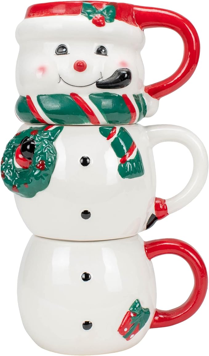 - (Stacked Set of 3); Add some holiday charm to your kitchen home décor with these adorable mugs; Stackable set is in the shape of a friendly snowman, decked out in holiday wreath and scarf