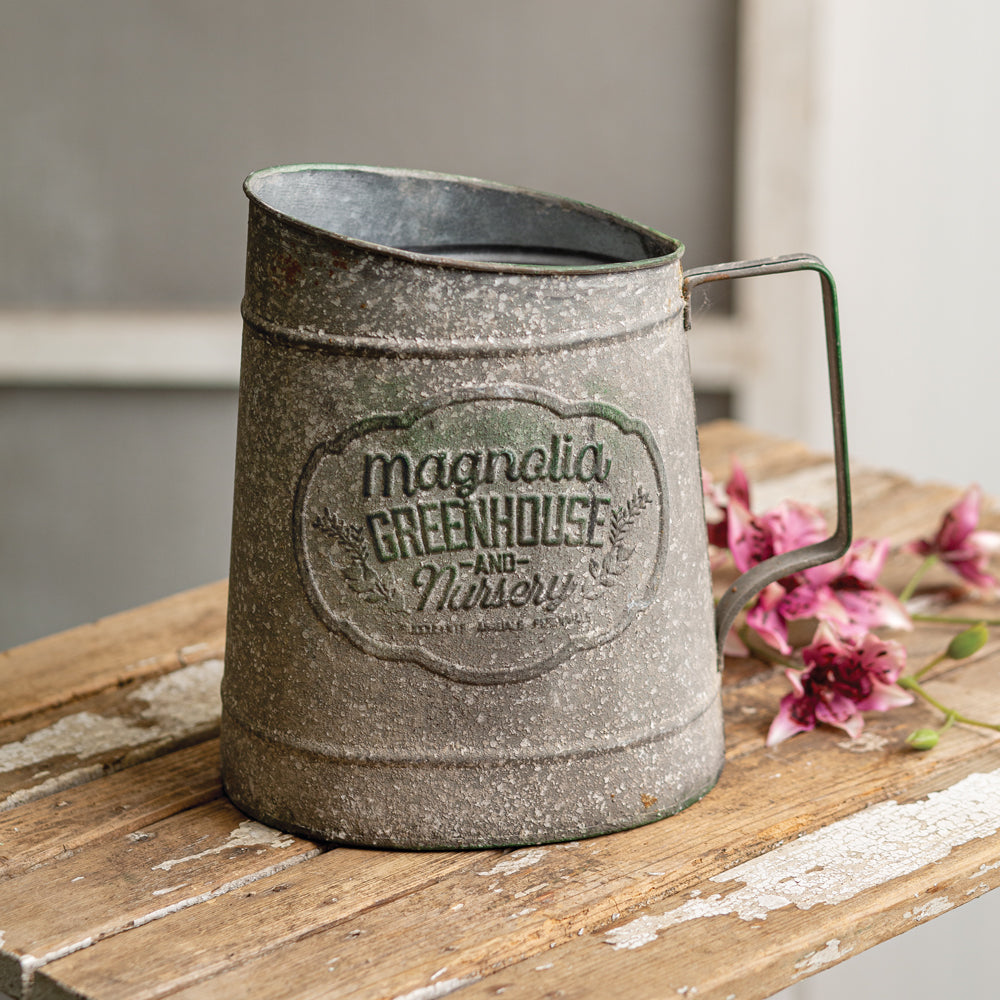 - This pitcher is made of metal. It reads ''Magnolia Greenhouse and Nursery''.