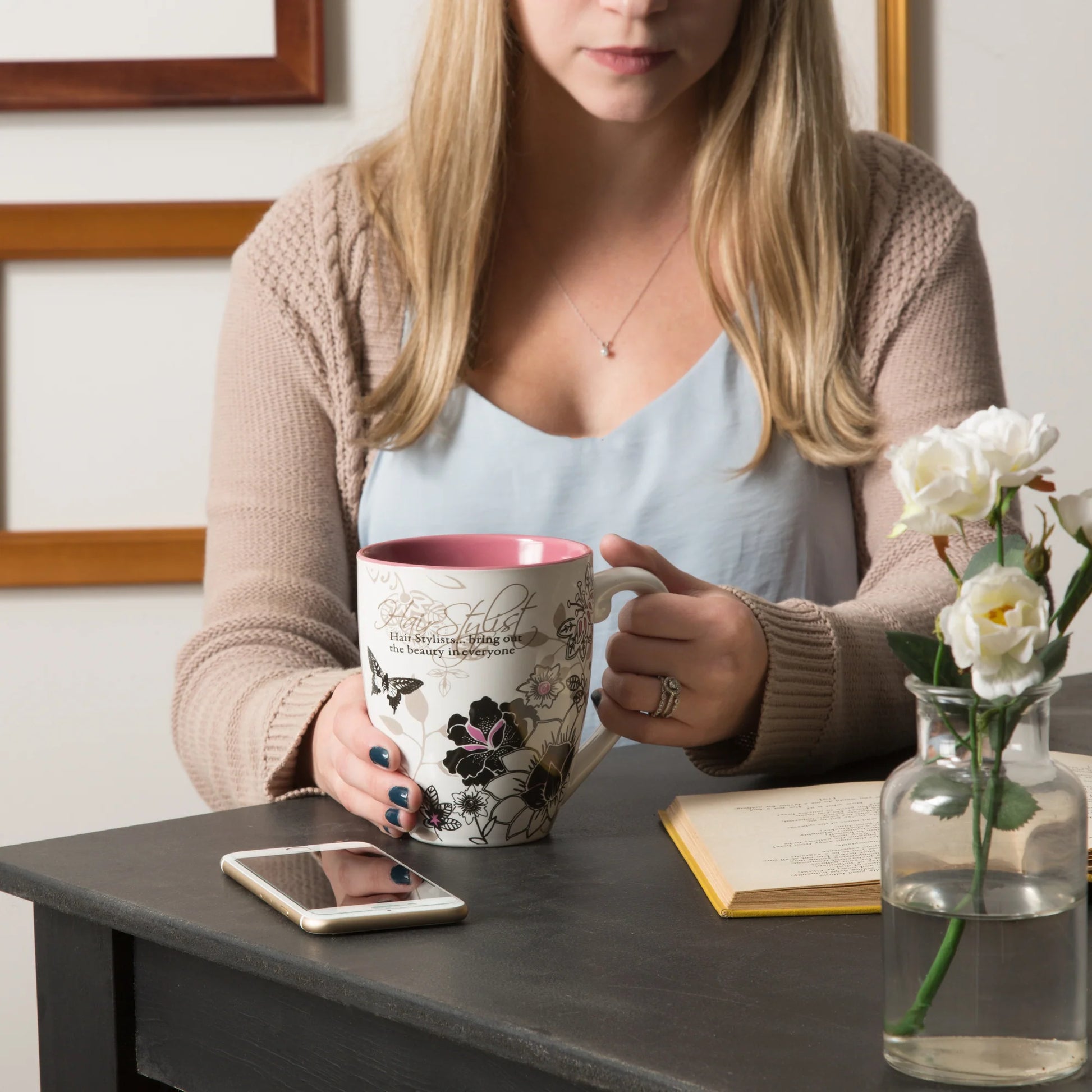 - IN-HOUSE DESIGN: Featuring an exquisite black-and-white floral pattern with delicate pink accents, this mug displays the inspiring message: "Hair Stylist; Hair Stylists… Bring Out The Beauty In Everyone." The artistic cursive script and sophisticated botanical details create a timeless, elegant look, making this mug a perfect addition to a salon, beauty studio, or home collection. Its versatile color palette complements any décor style, from modern to classic.