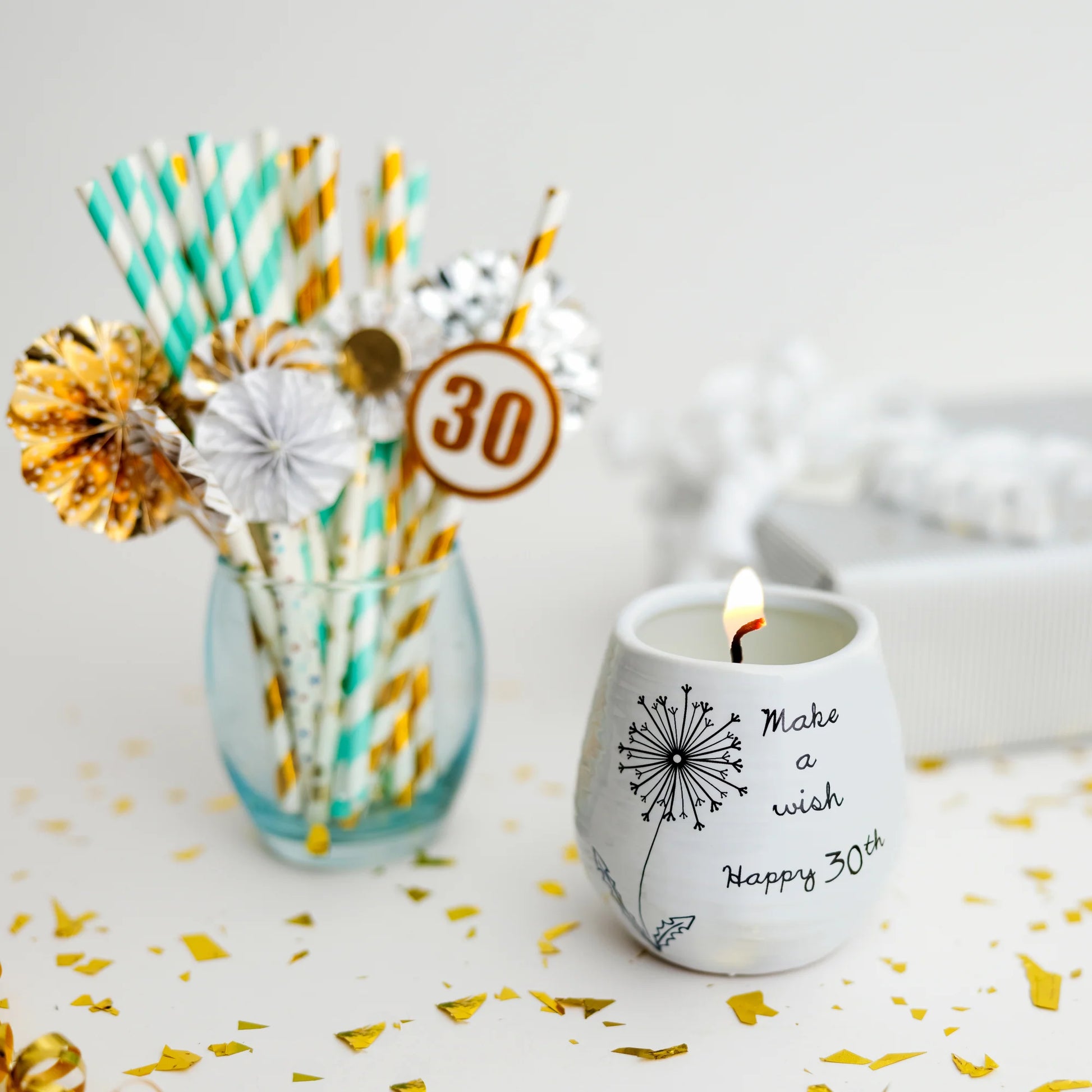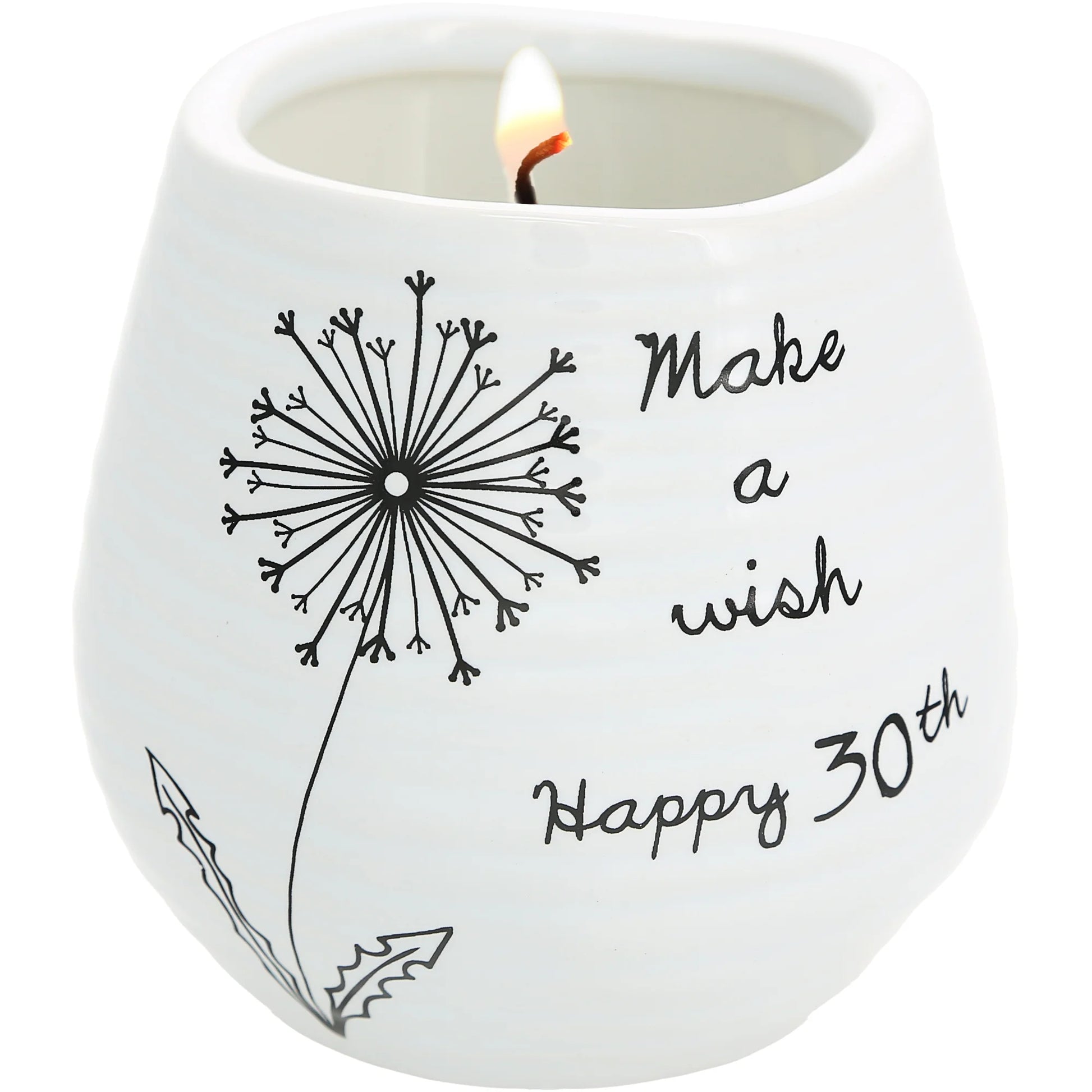 - IN-HOUSE DESIGN: "Make A Wish; Happy 30th" text on the front of the candle is printed, as are the accompanying dandelion details.