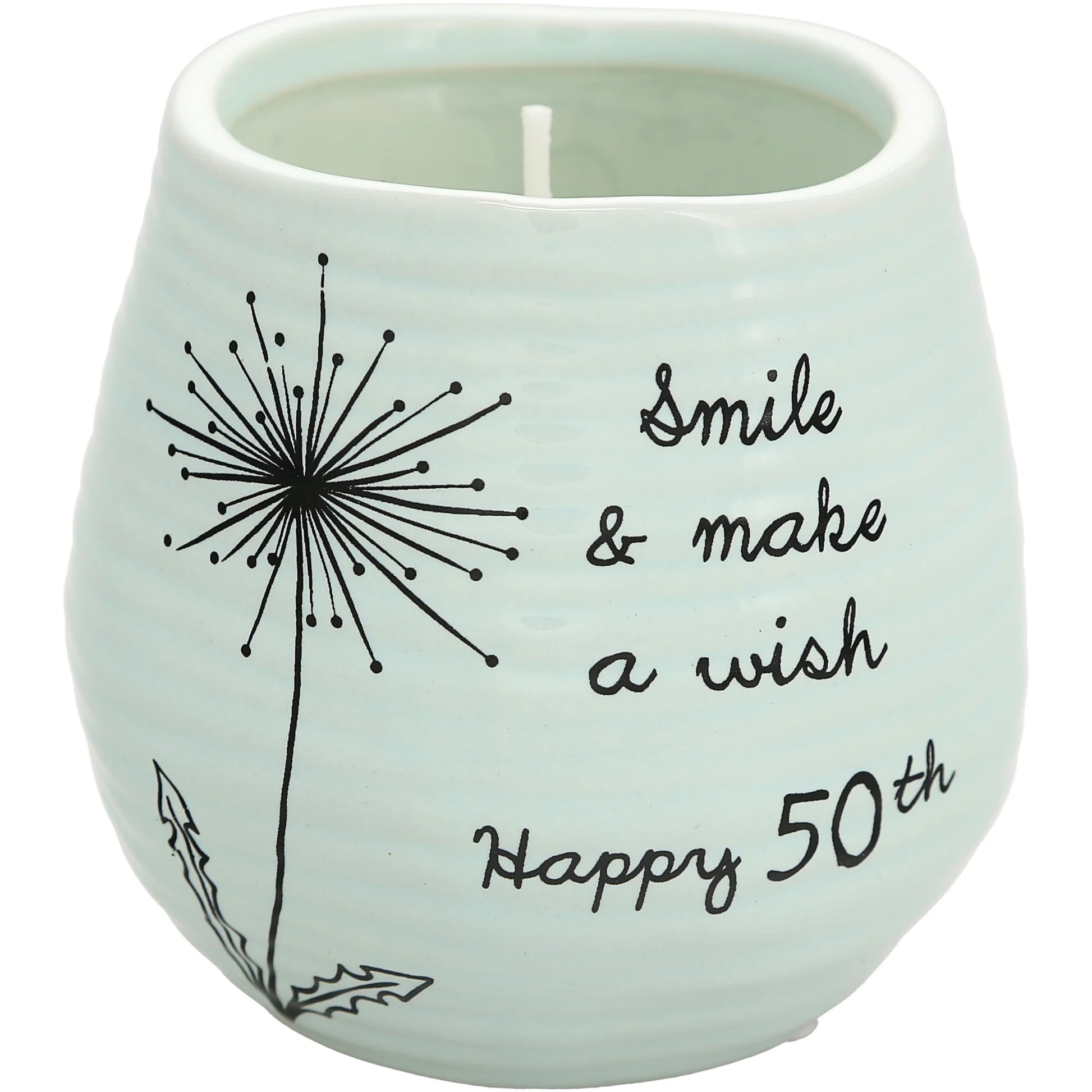- IN-HOUSE DESIGN: "Smile & Make A Wish; Happy 50th" text on the front of the candle is printed, as are the accompanying dandelion details.