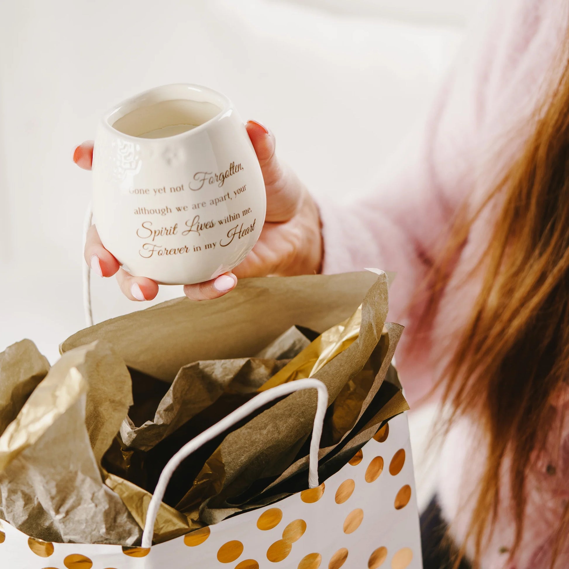 - IN-HOUSE DESIGN: "Gone Yet Not Forgotten, Although We Are Apart, Your Spirit Lives Within Me, Forever In My Heart" text is printed onto the front of the candle holder.