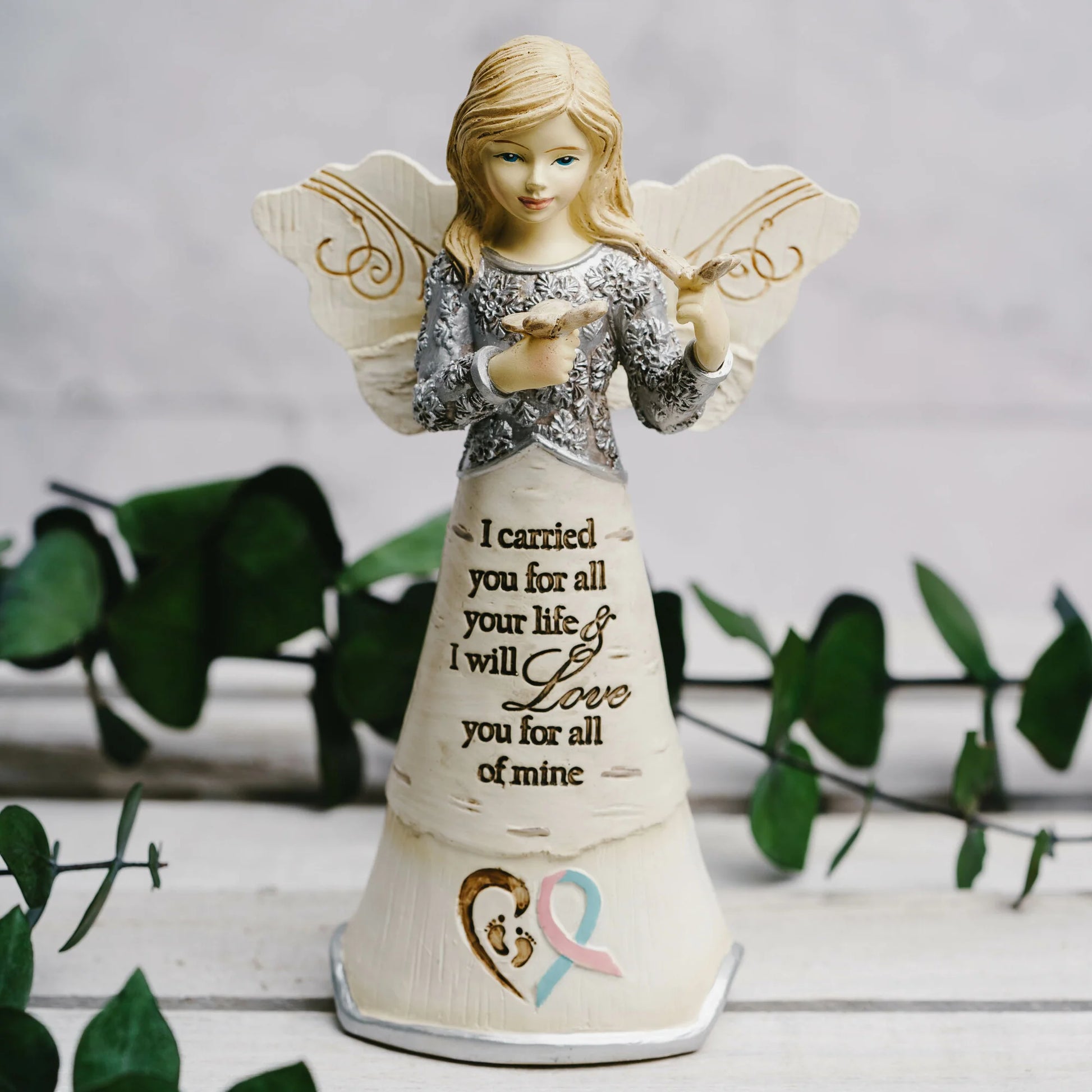 - IN-HOUSE DESIGN: This beautiful blonde haired angel is holding a butterfly in each hand. The butterflies represent transformation, change, hope and life. The bottom of the angel piece has a heart that is half pink and blue and half with tiny footprints signifying the loss of an angel baby. "I Carried You For All Your Life & I Will Love You For All Of Mine" text and miscarriage icon are both debossed and painted onto the front of the angel, alongside an intricate silver design and butterflies.