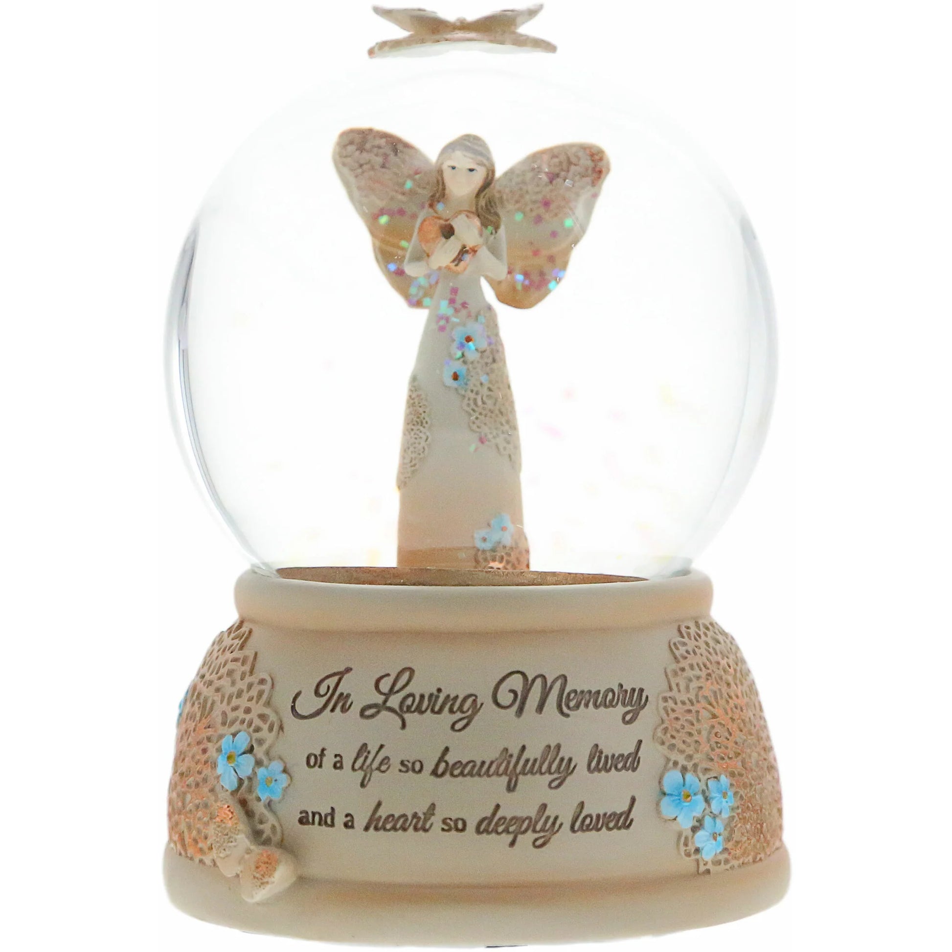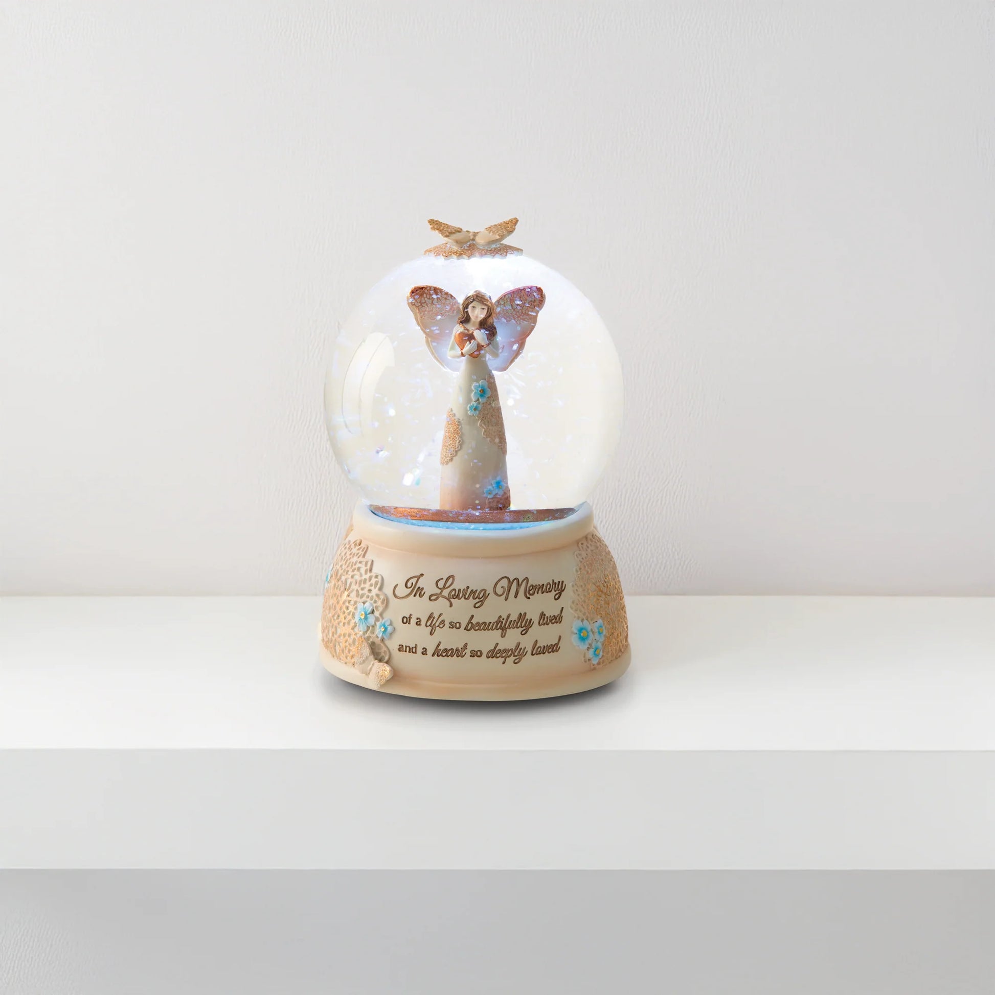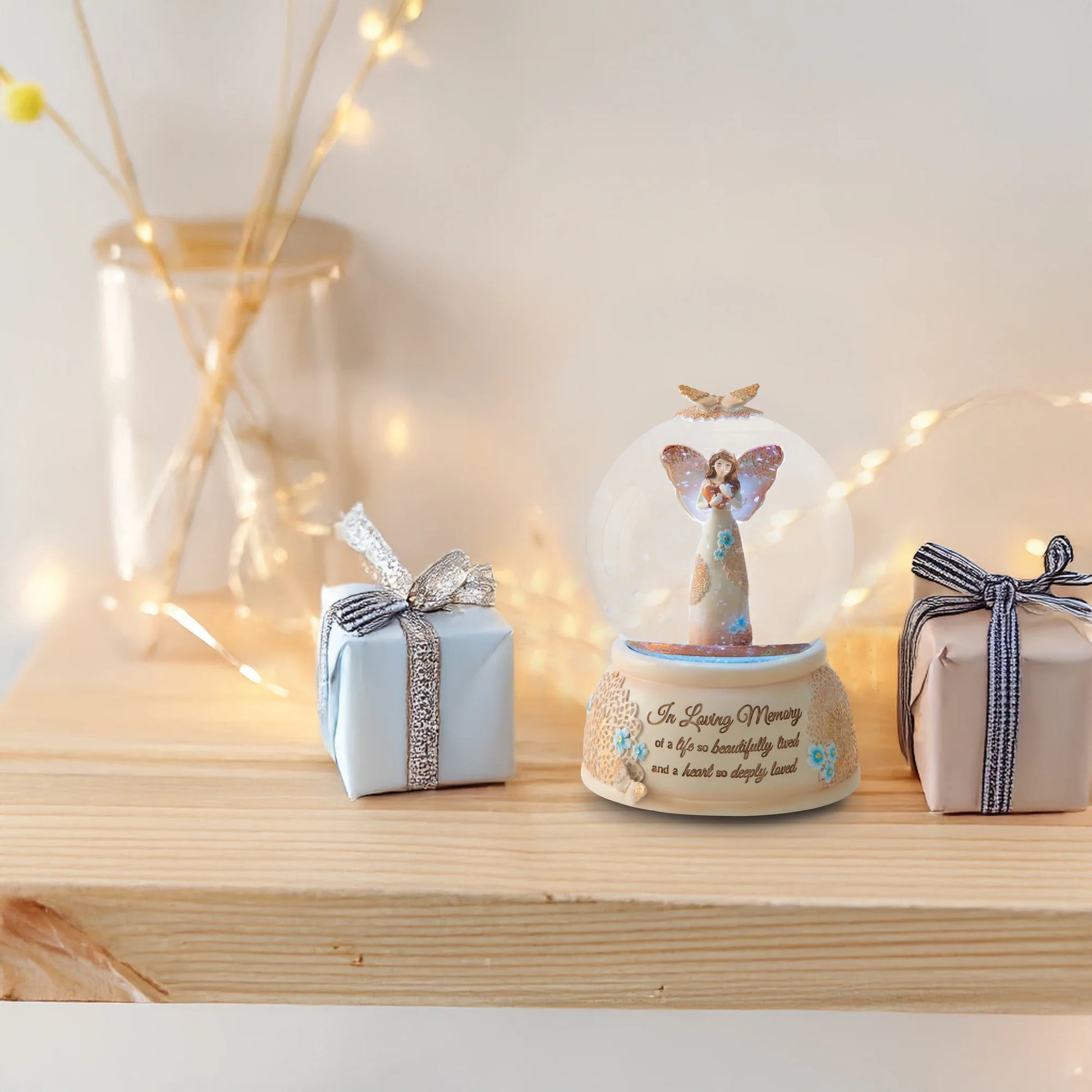 - IN-HOUSE DESIGN: The base features the touching inscription, "In Loving Memory Of A Life So Beautifully Lived And A Heart So Deeply Loved," debossed and hand-painted with intricate butterfly and floral accents. The water globe contains an LED-lit angel figurine surrounded by a gentle snow-like effect, adding an ethereal glow.