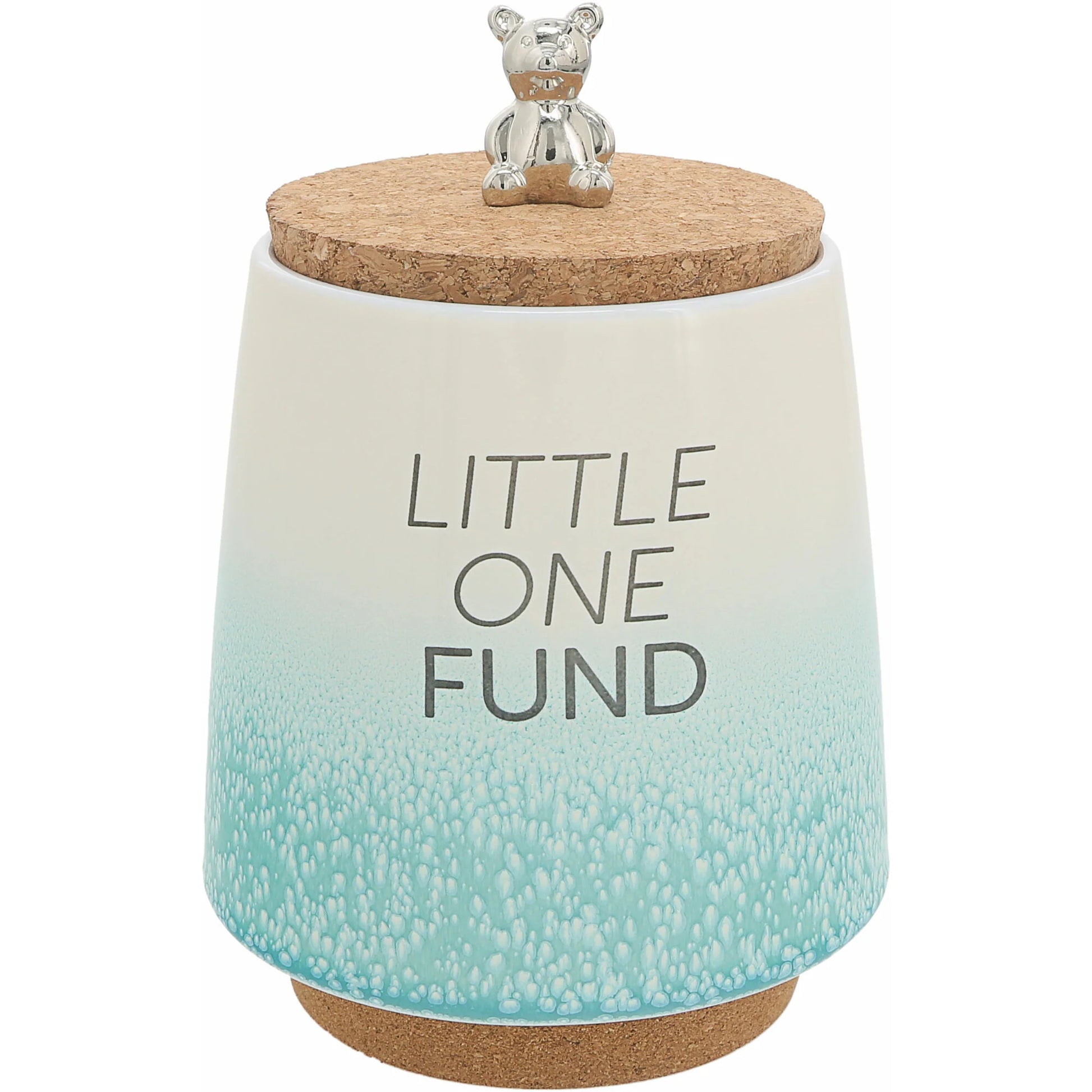 - IN-HOUSE DESIGN: The front side of the piggy bank has a simplistic "Little One Fund" gray sentiment and an ombre glossy reactive dripped speckling glaze that fades from white at the top to teal at the bottom. The interior of the jar features fill lines accompanied by sentiments that are .75 inches from one another. The very bottom line "Not Enough Fund$" goes up to 1.5 inches from the base, followed by "Getting There," leading to "So Much Fund$" with "Fully Funded" at the top.