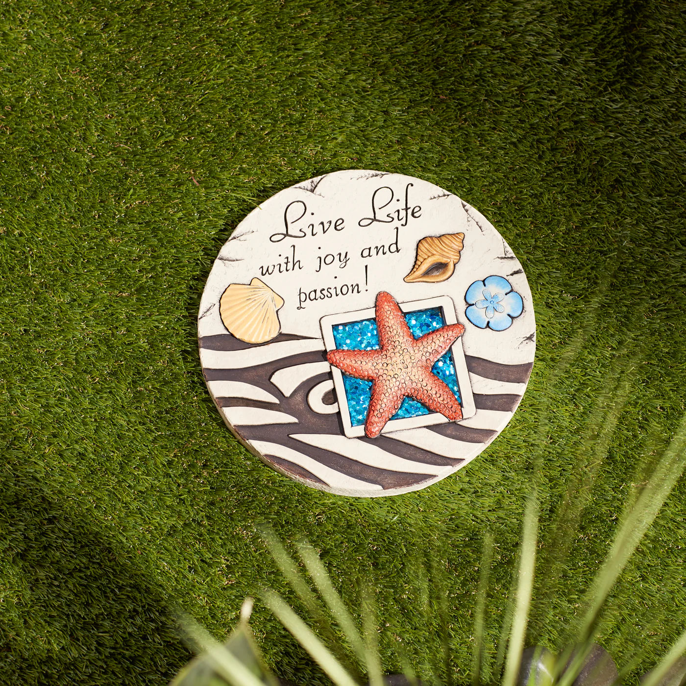 Bring the beach home to your yard! Turn your garden into a place of gathering with this warm and inviting welcome stepping stone. The glitter overlay makes the starfish pop and emits a subtle sparkle in the sunlight.
