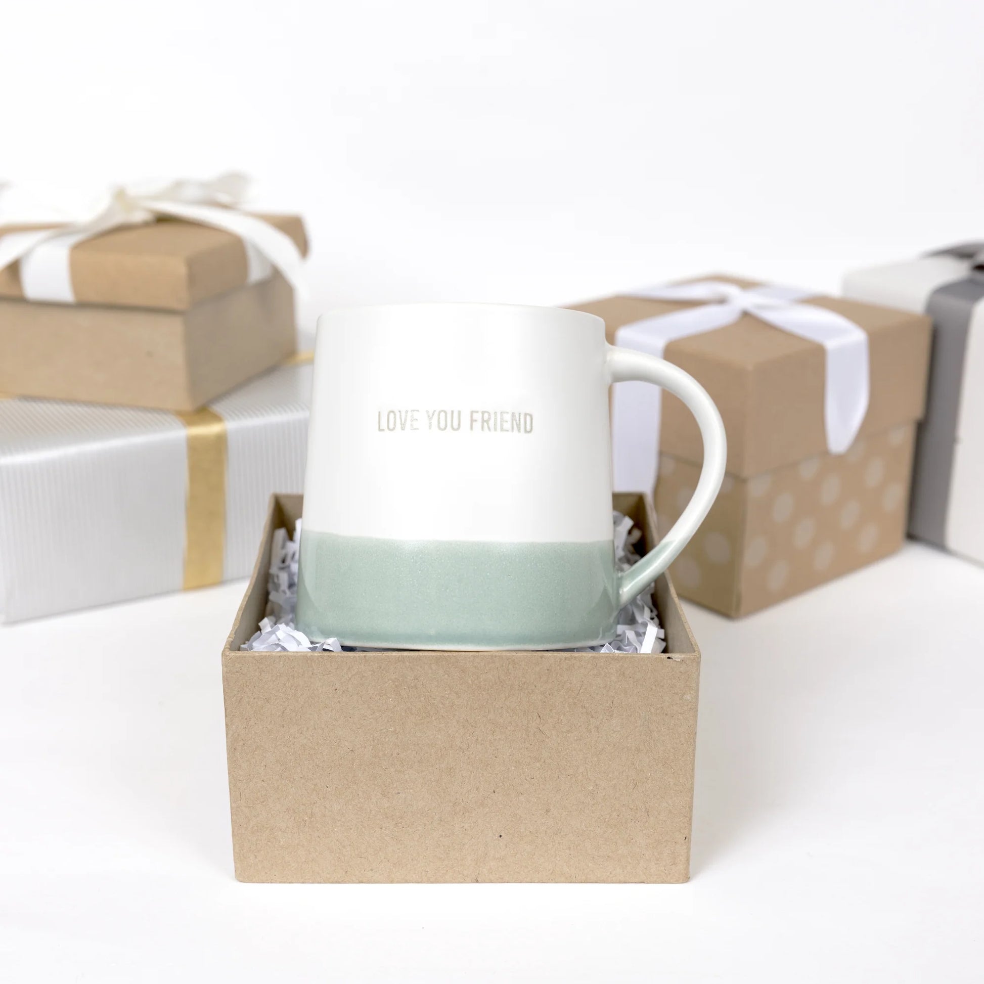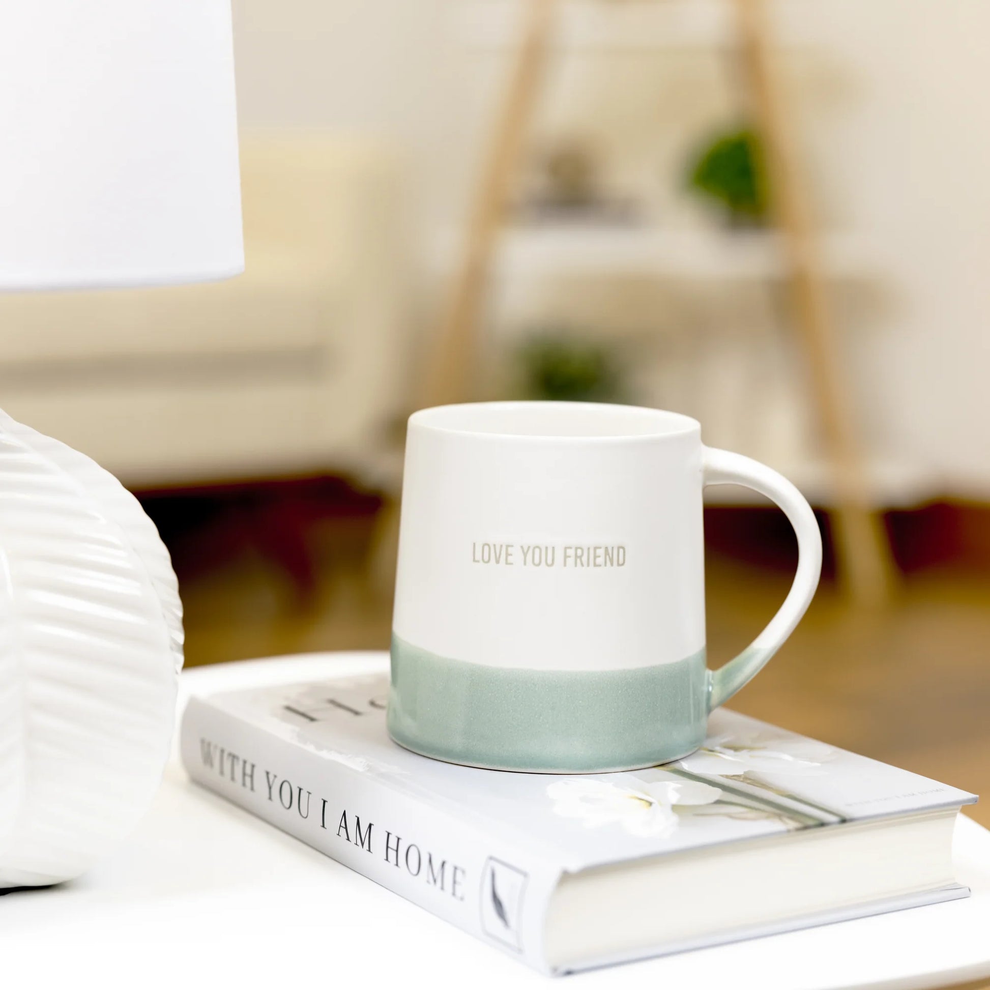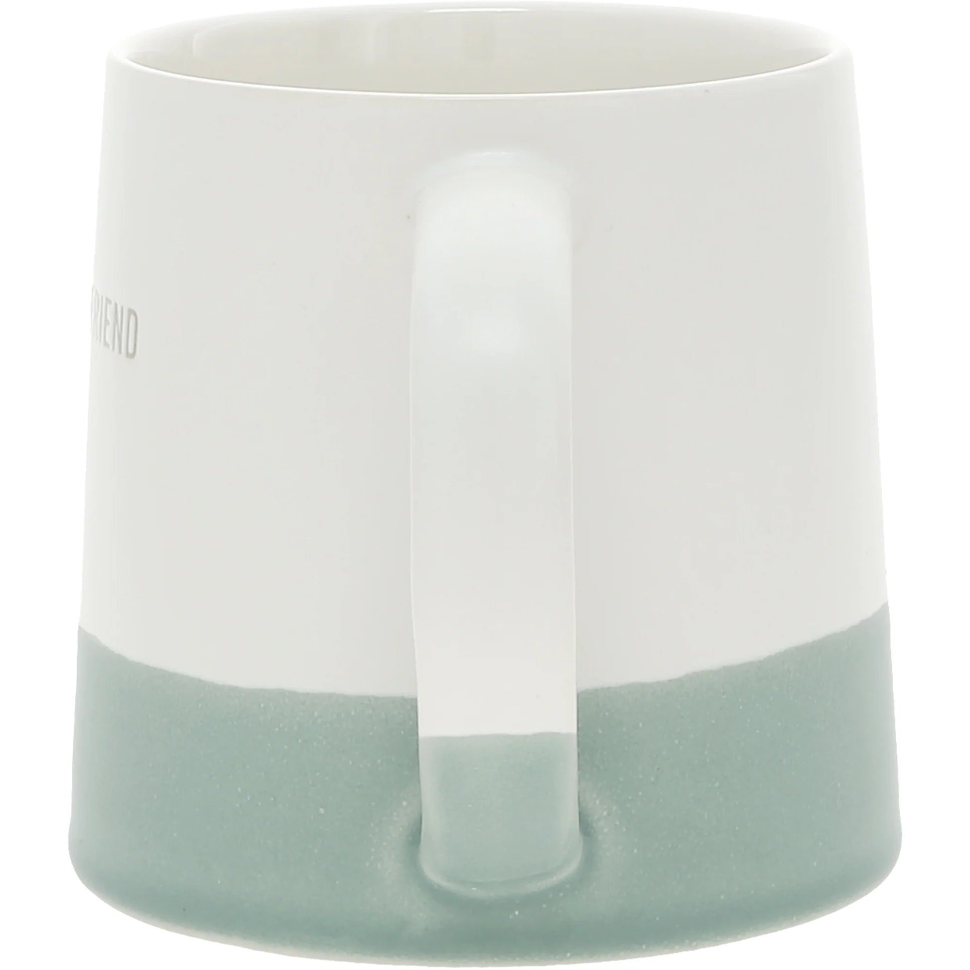 - IN-HOUSE DESIGN: The hand-dipped 1/3 green-colored bottom is unique to each piece. The tan debossed "Love You Friend" sentiment is stamped in the middle center of the white upper half of the front side of the cup. This simplistic, modern-styled mug is the perfect addition to any drinkware collection.