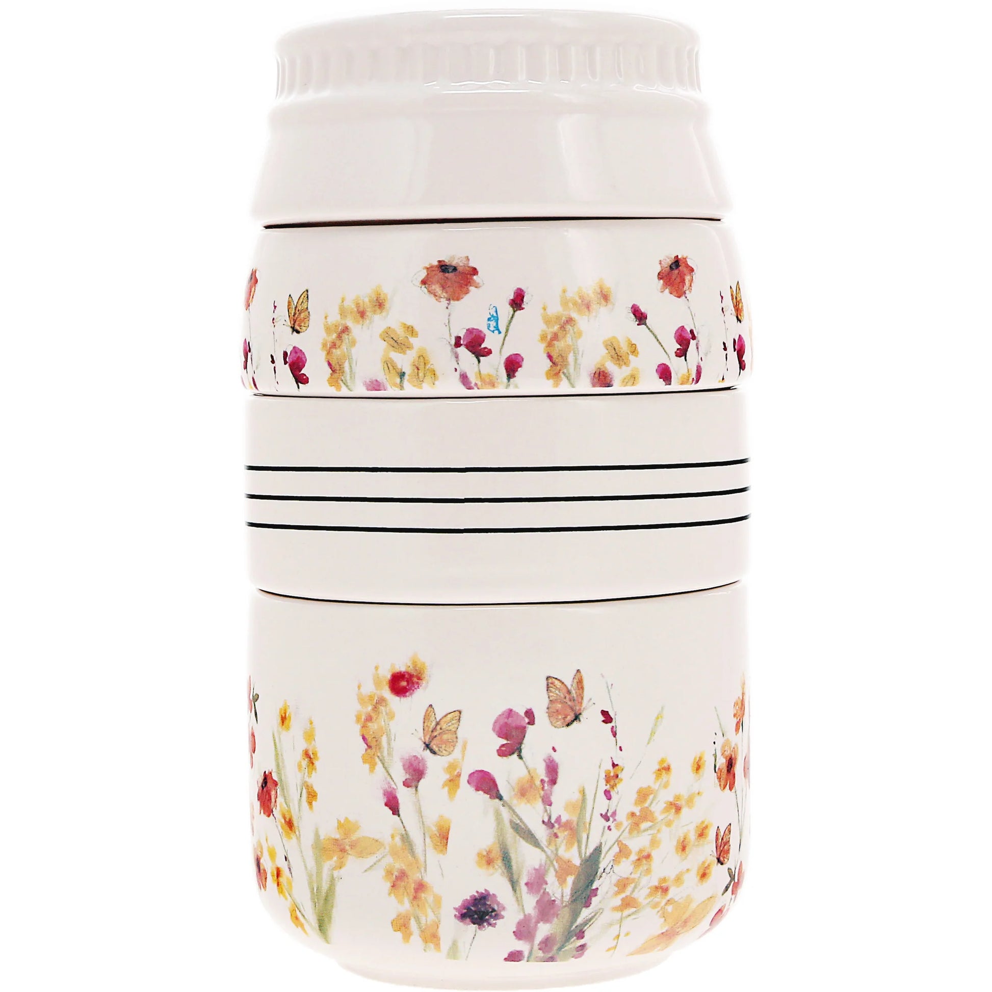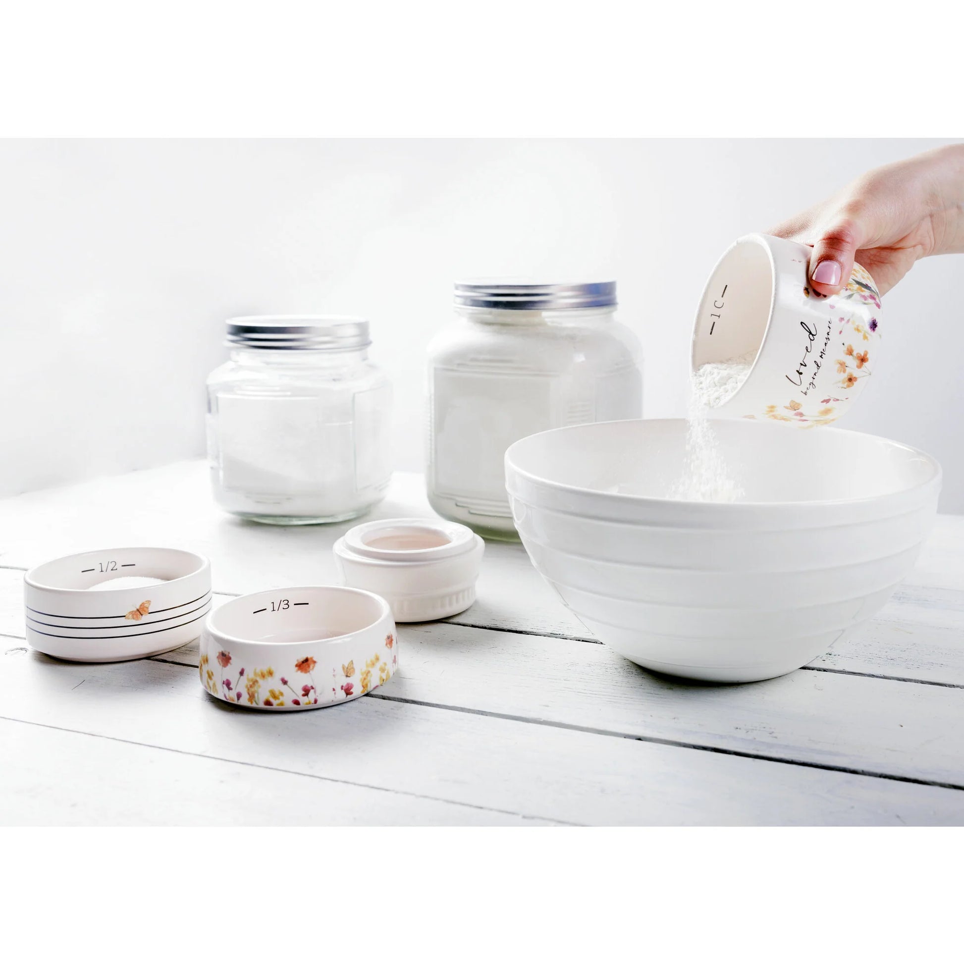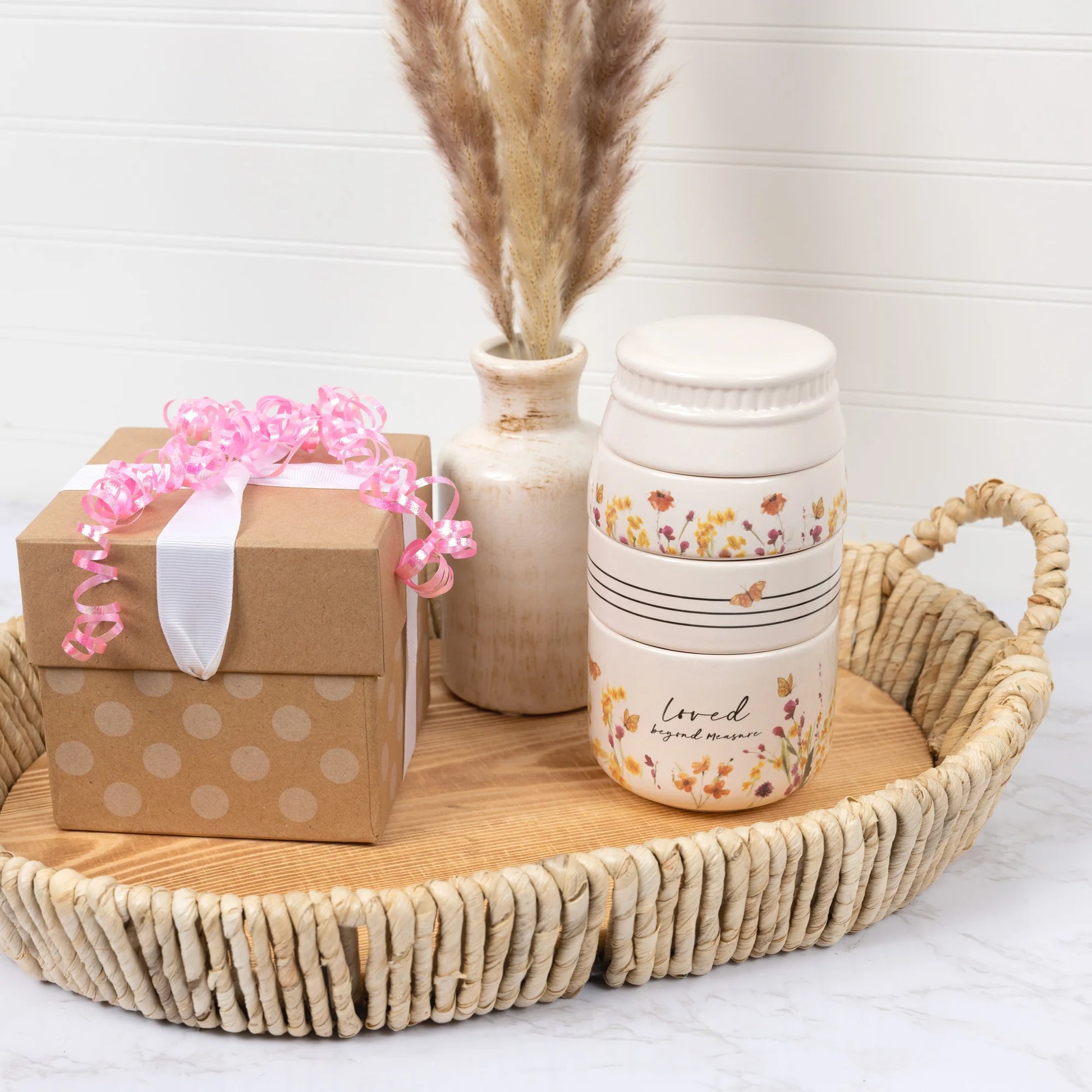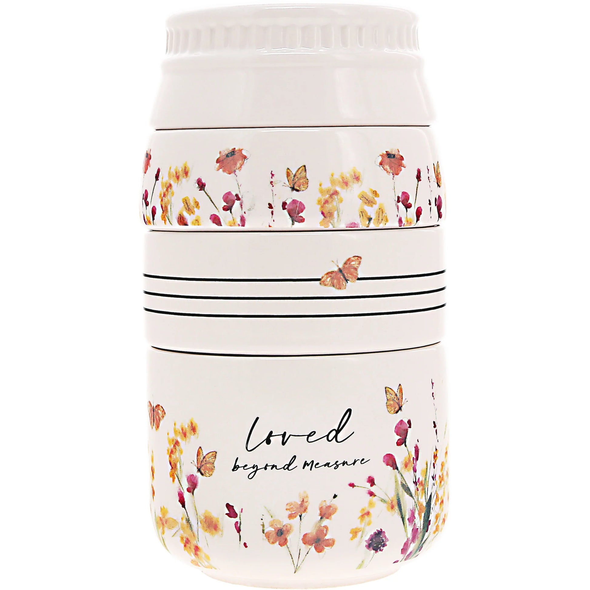 - IN-HOUSE DESIGN: The top 1/4 cup has a white lid, the 1/3 cup has butterflies and flowers, the 1/2 cup has three black stripes and a butterfly, & 1 cup has a "Loved Beyond Measure" sentiment along with more butterflies and florals. Finally, the interior of each piece has lines and text for measuring purposes. All designs wrap around the entirety of each piece.