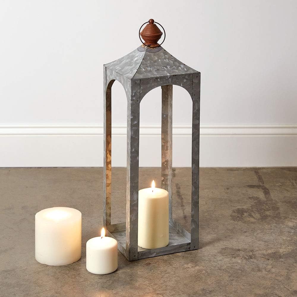 - This small lantern is made of galvanized metal and includes a handle on top for transportation.