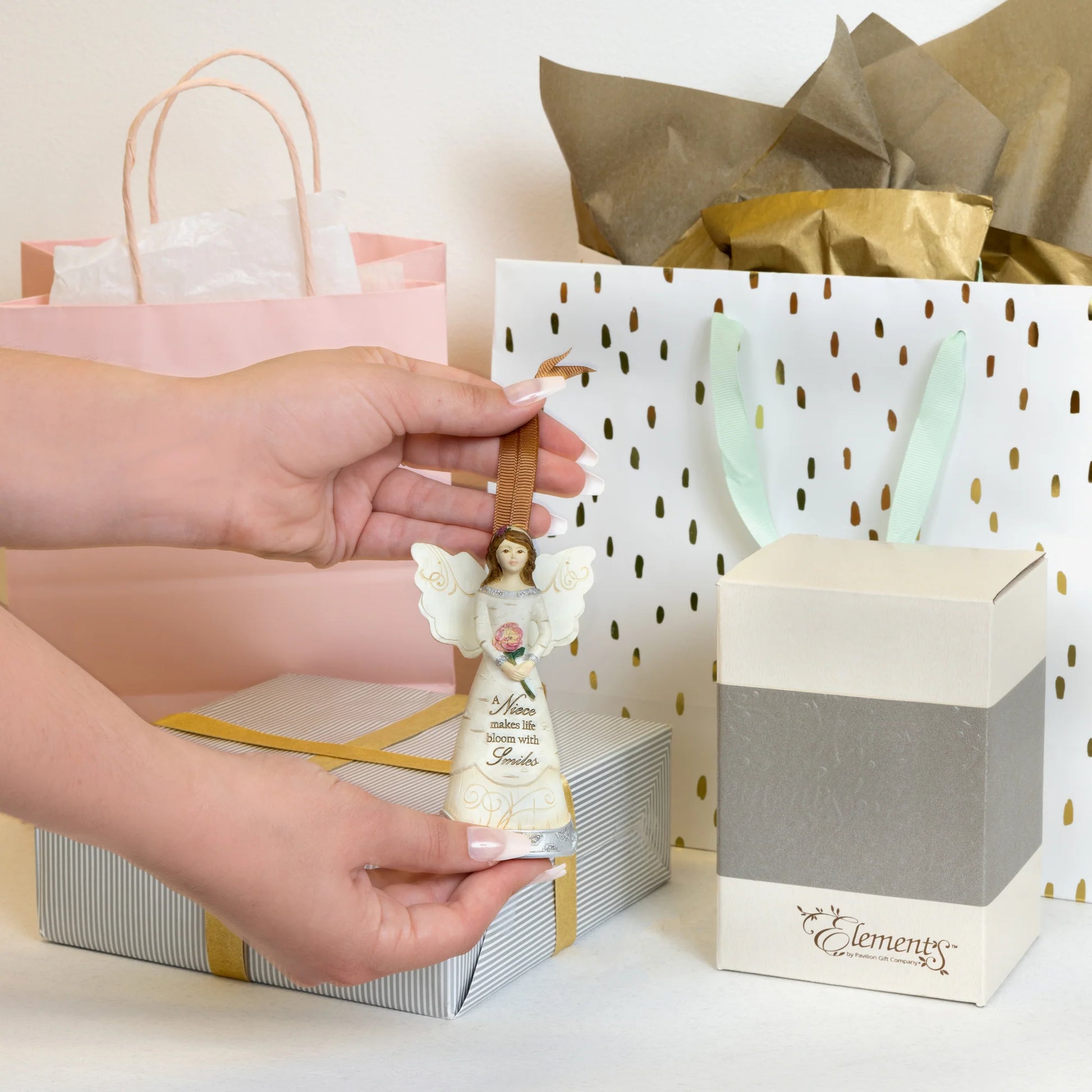 - IN-HOUSE DESIGN: "A Niece Makes Life Bloom With Smiles" text is debossed and painted onto the front of the angel, alongside an intricate silver design and flower.