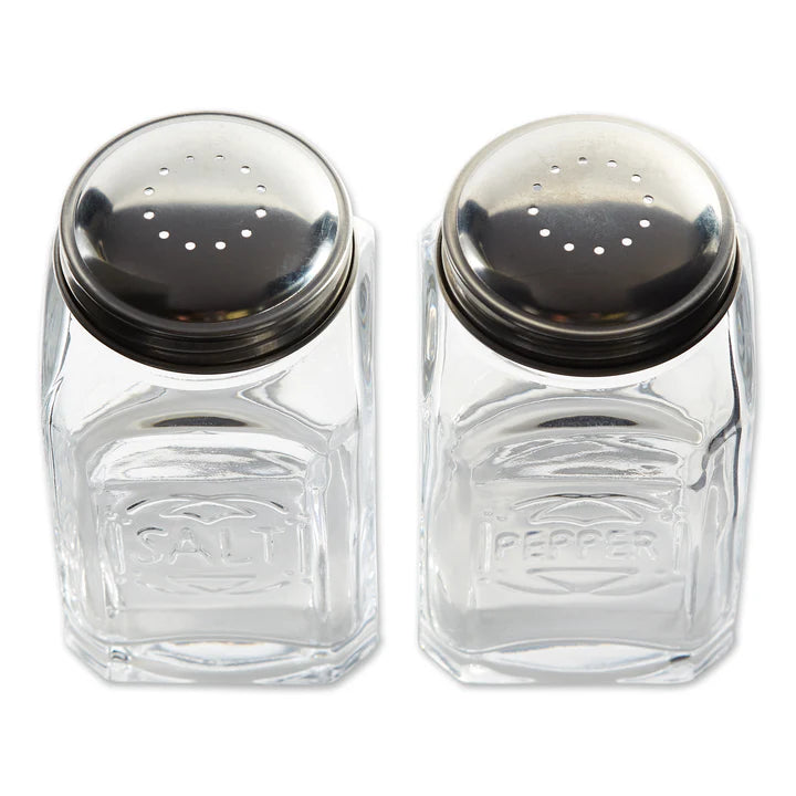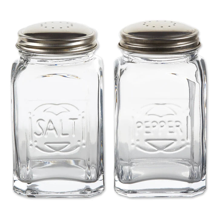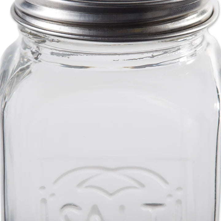 - Retro inspired glass shakers with stainless steel screw-on lids.