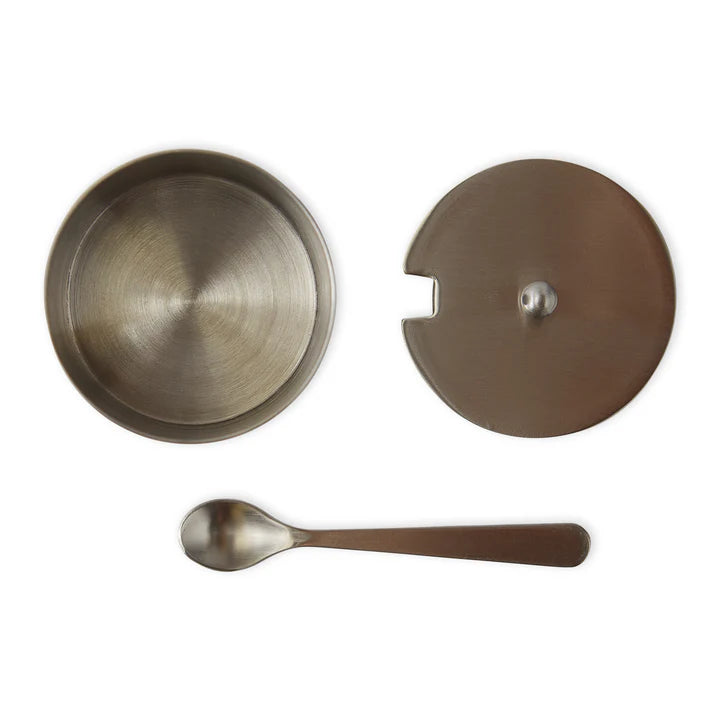 - Salt cellar with notch in lid to hold included salt spoon in place.