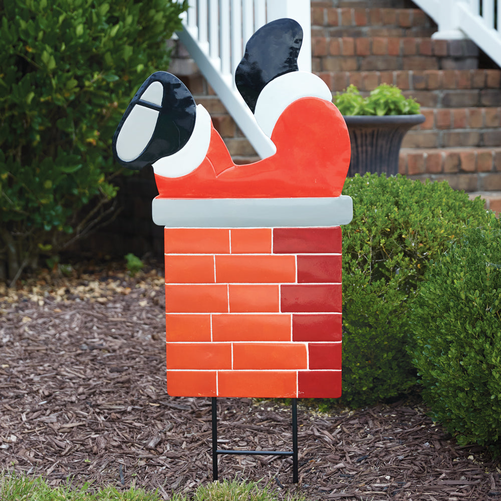 It’s the most wonderful time of the year when Santa brings the little boys and girls lots of toys. This jolly yard stake depicts just that, with a Santa coming down the chimney. Feature in the yard for a joyful touch at Christmas. Item is made of metal.