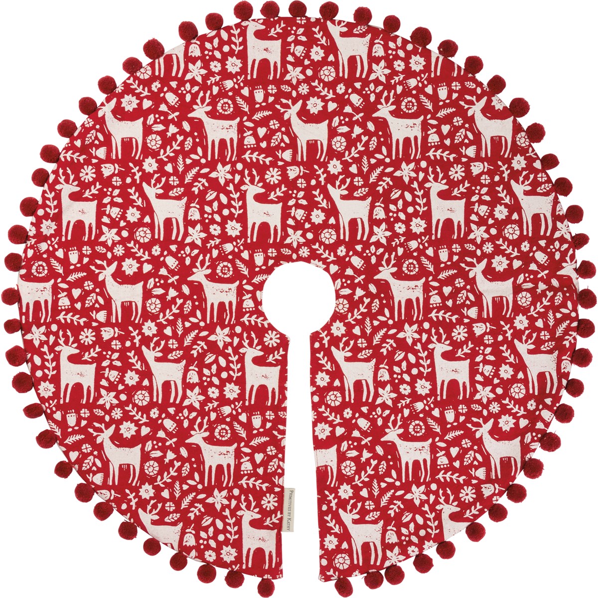 - The Scandinavian Reindeer Tree Skirt contains pom trim details and back slit opening for easy decorating.