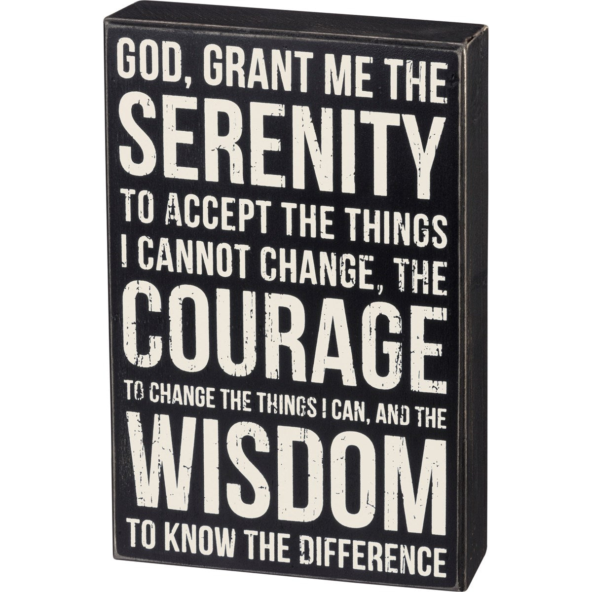 - A classic black and white wooden box sign featuring a distressed "God, Grant Me The Serenity To Accept The Things I Cannot Change, The Courage To Change The Things I Can, And The Wisdom To Know The Difference" sentiment.