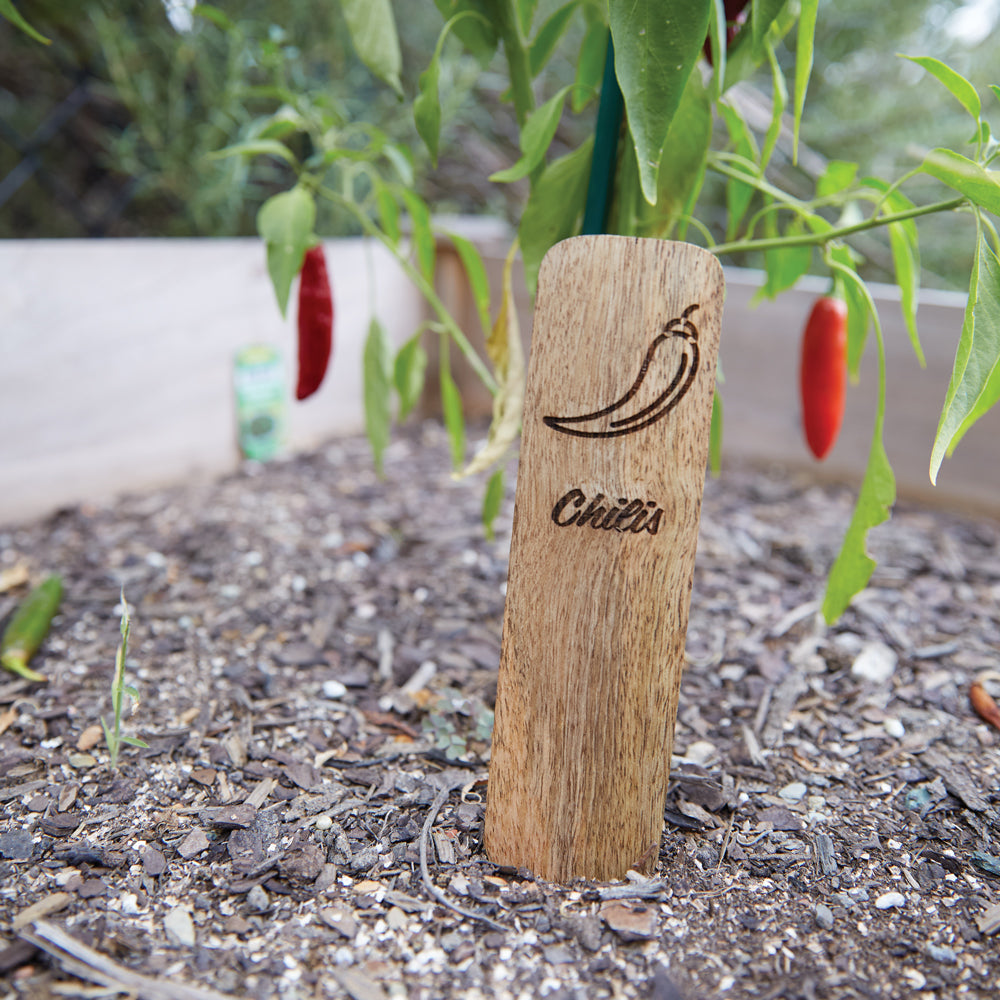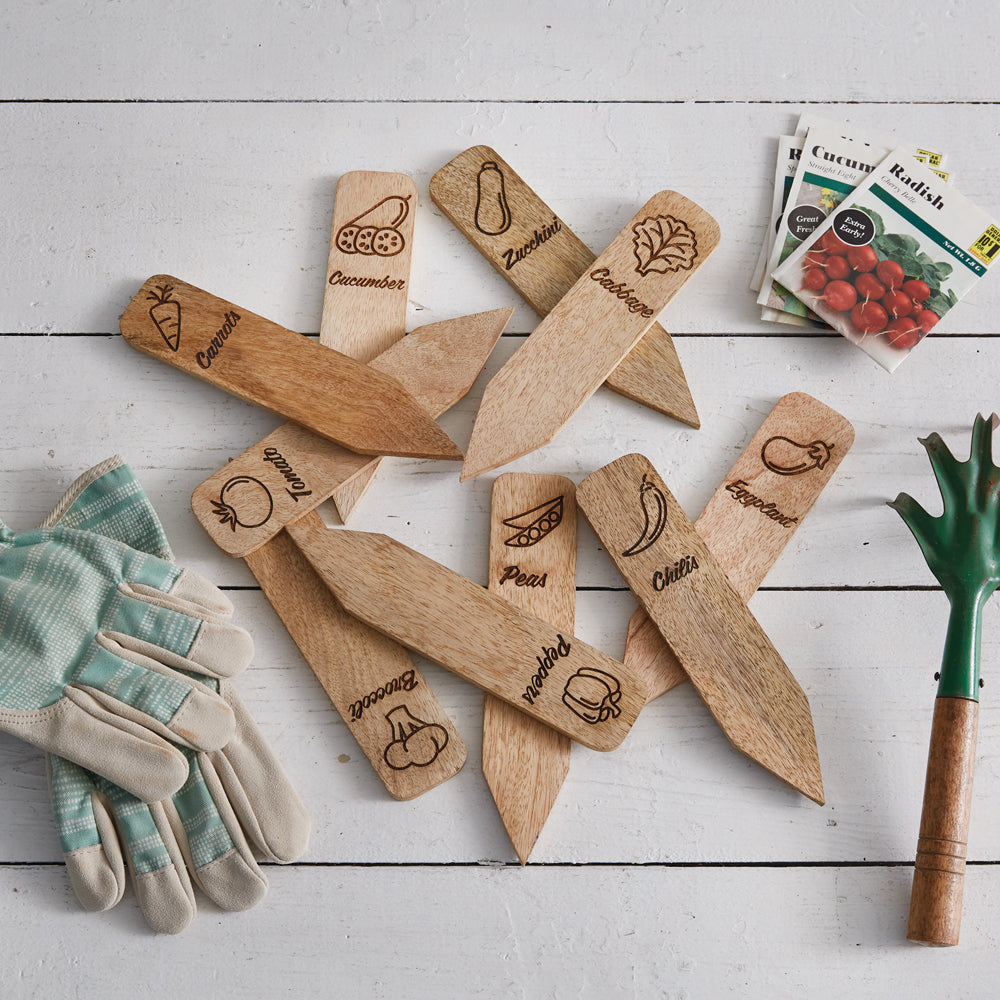Keep track of your seedlings and watch them grow into beautiful produce plants with our vegetable markers. Each marker is crafted of wood and features different produce: cucumber, broccoli, tomato, zucchini, cabbage, carrots, eggplant, chilis, peppers, and peas. They are packaged together to easily gift to a new or seasoned gardener. Packaging measures 11¾''W x 1¼''D x 17''H.