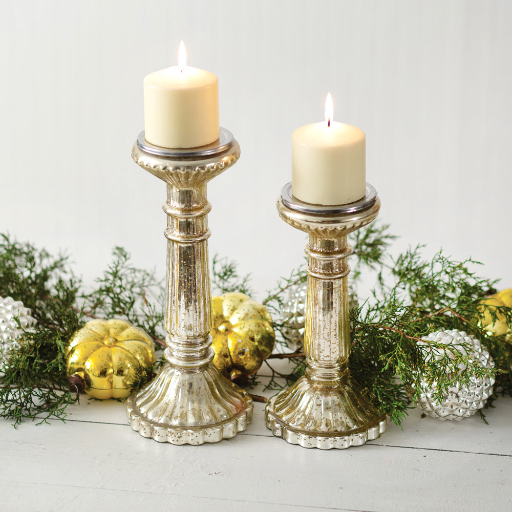 Add sparkle to your table this year with this Set of Two Mercury Glass Pillar Candle Holders. It features gold metallic finish and holds a 3'' candle. The smallest measures 5'' dia. x 10''H.