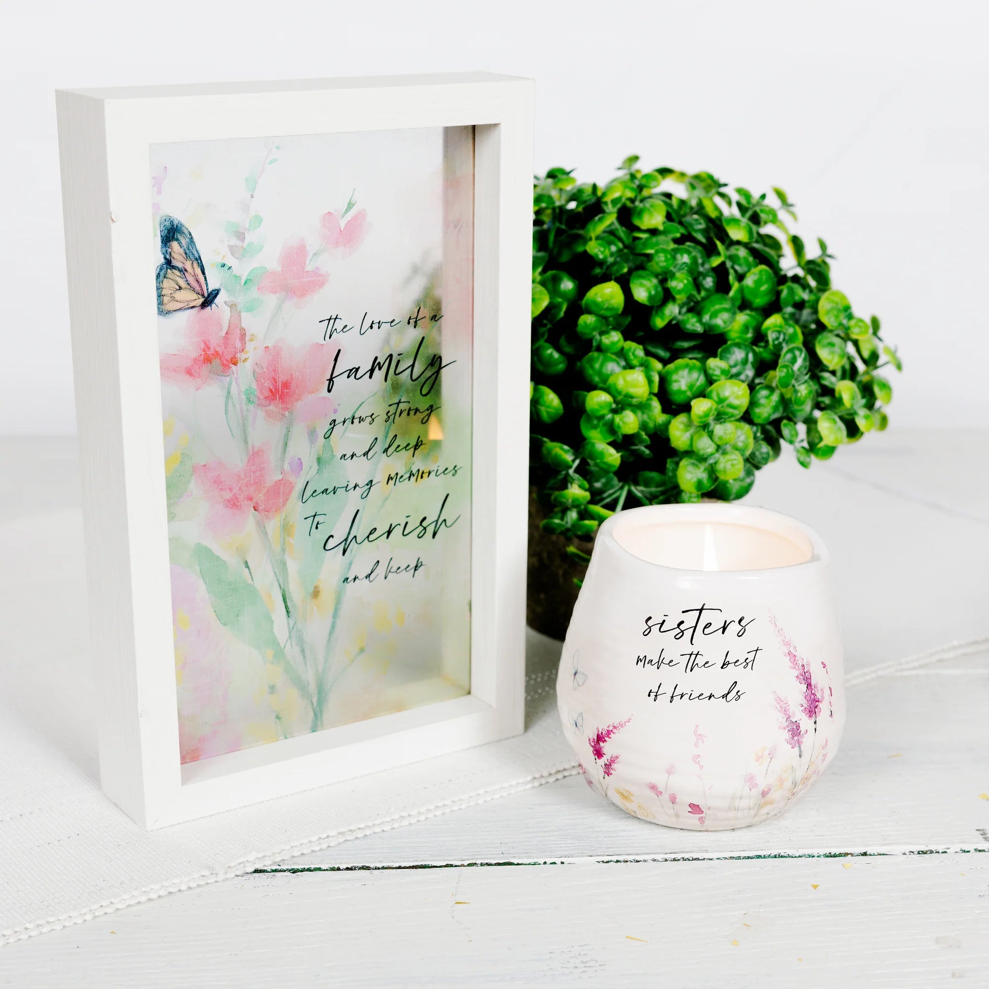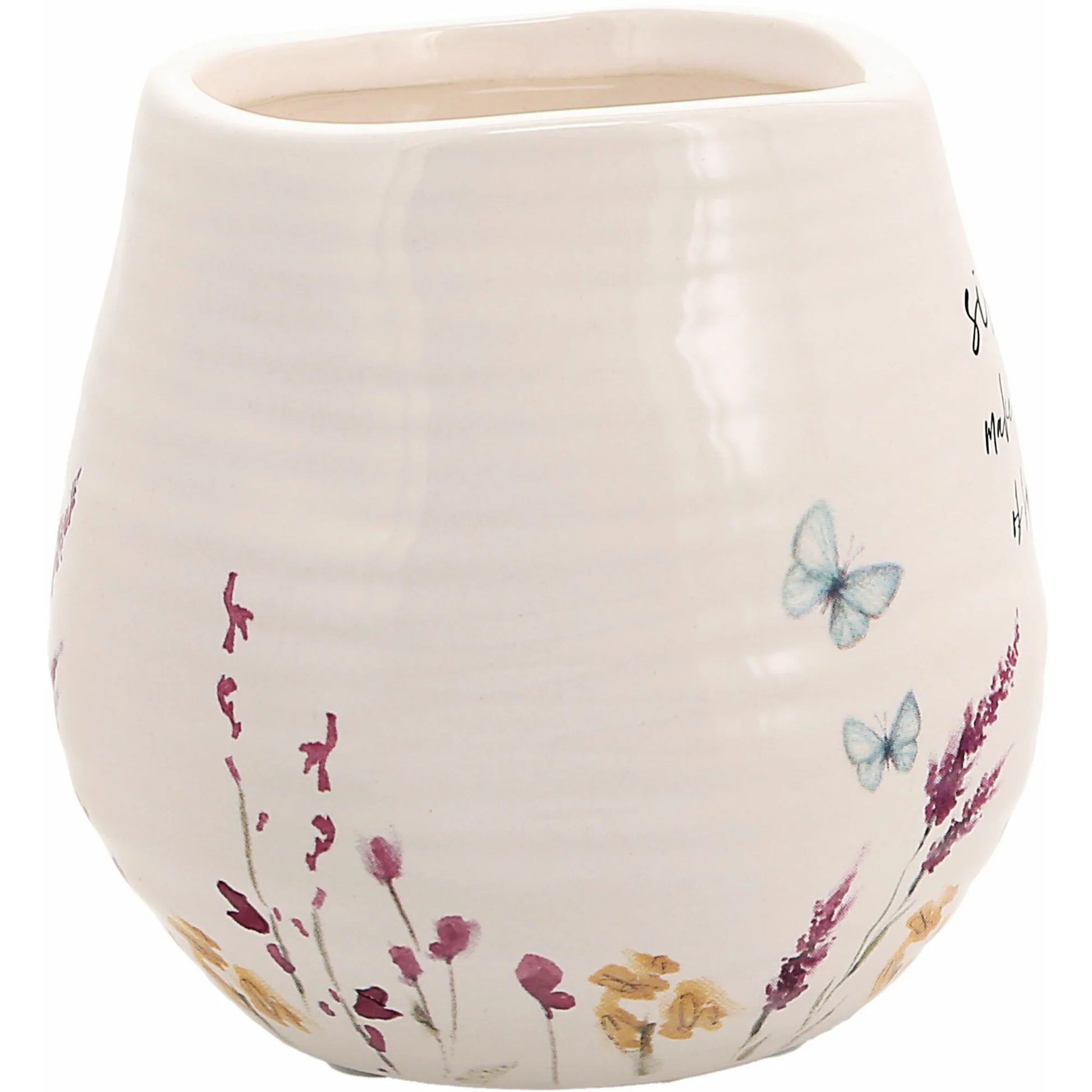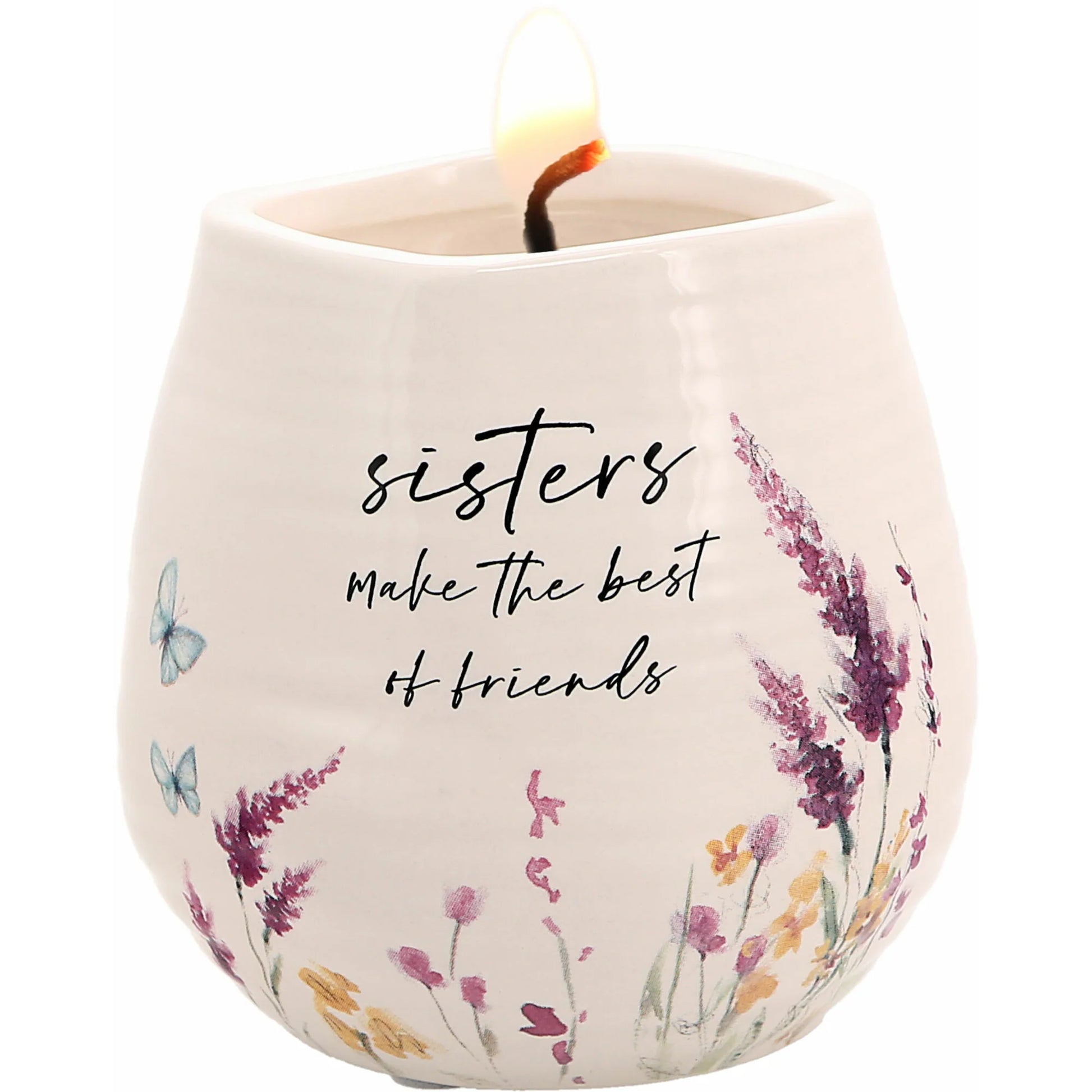 - IN-HOUSE DESIGN: Purple, yellow, and green watercolor paint-inspired floral patterns with teal butterflies are accompanied by the "Sisters Make The Best of Friends" glossy sentiment decal on the front side of this shiny ribbed cream vessel. The artwork was designed by artist AmyLee Weeks, who sees the beauty in everyday life.