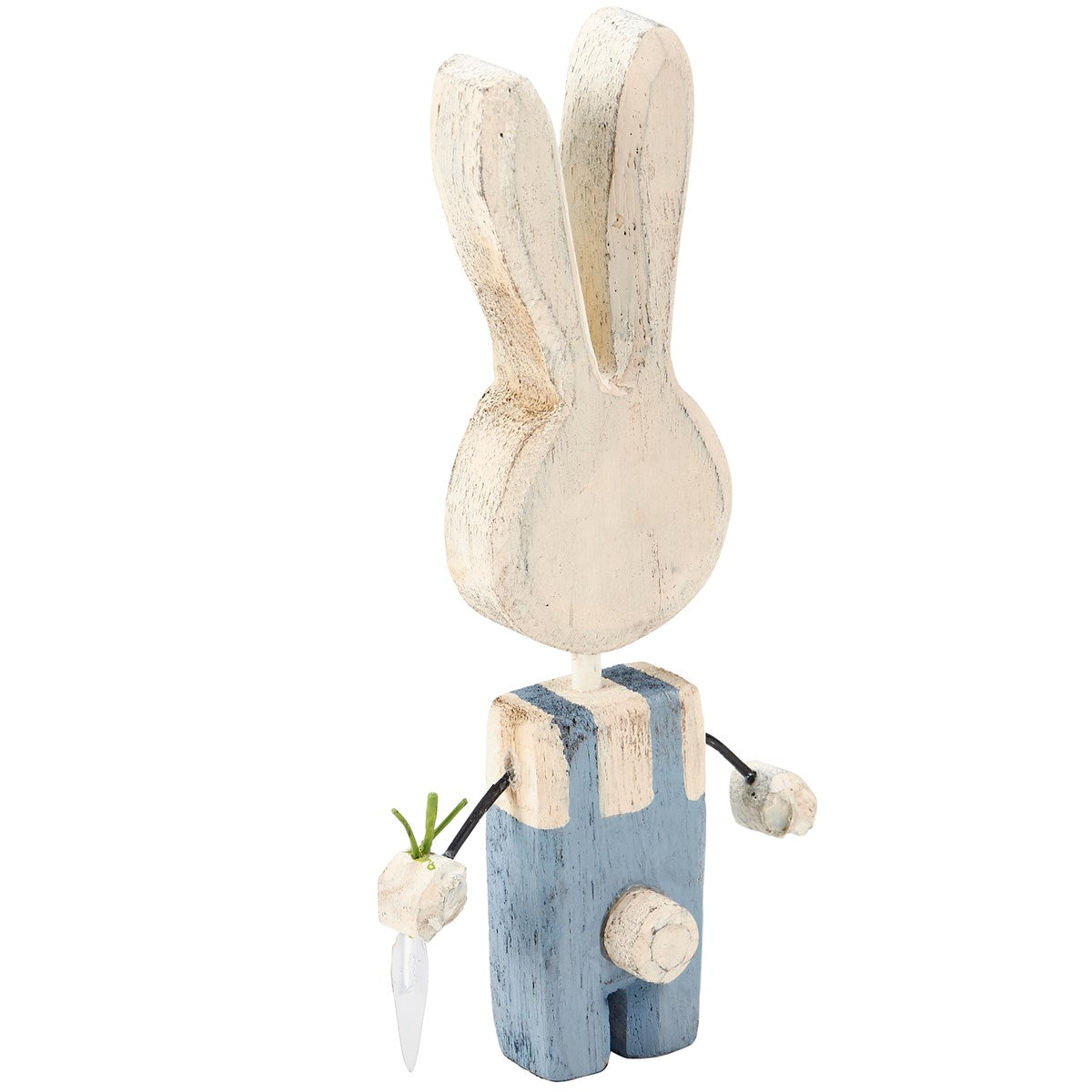 - A wooden sitter from our Easter & Spring Collection displaying a delightful bunny wearing polka dot overalls and holding a carrot recreated from an original hand carved and painted piece with distressed details.