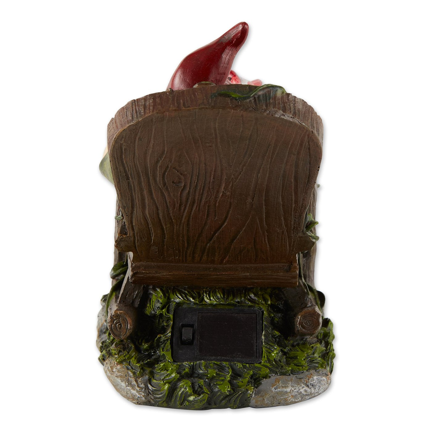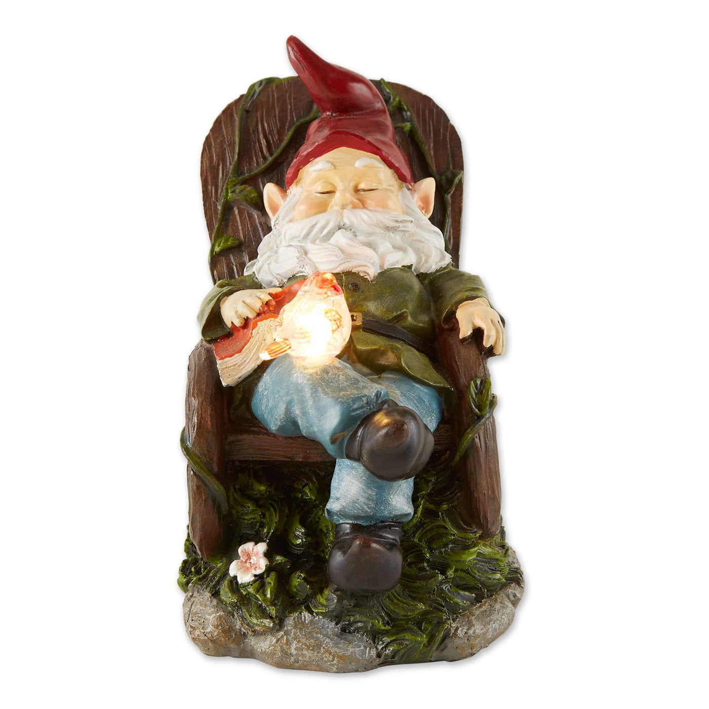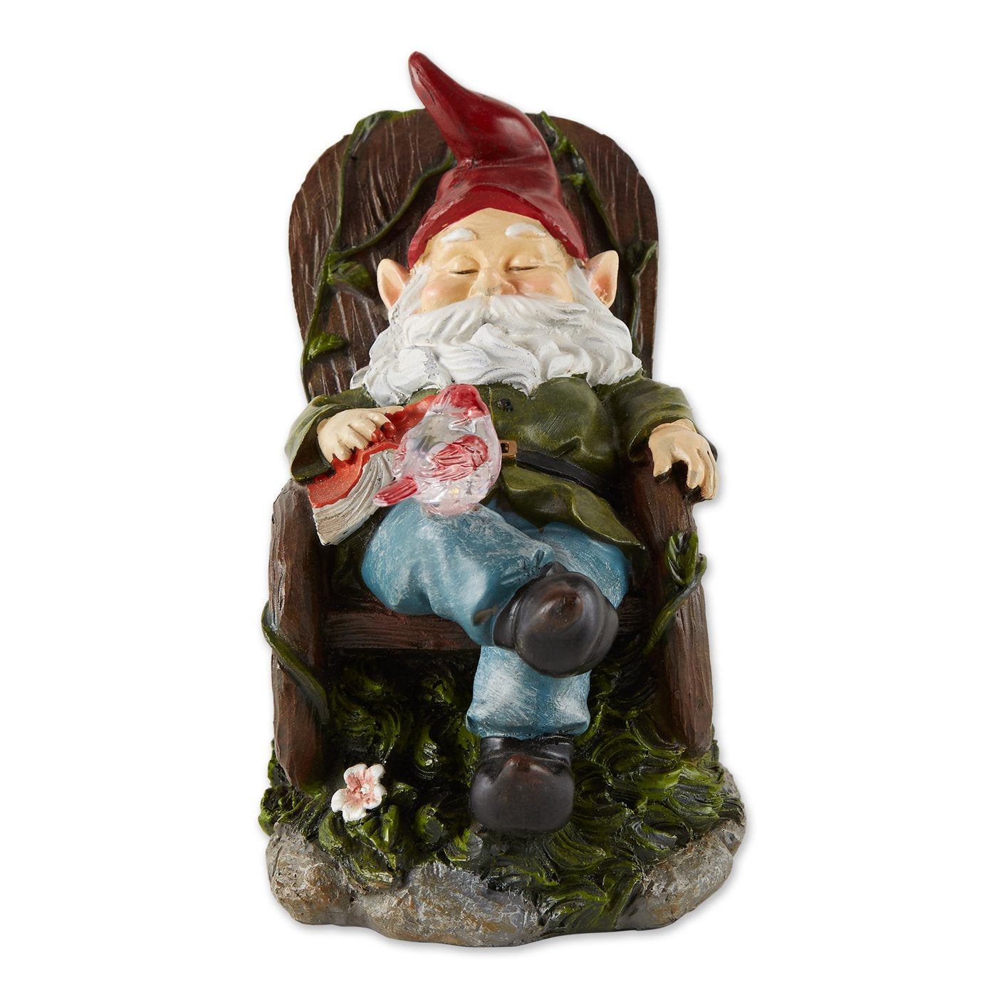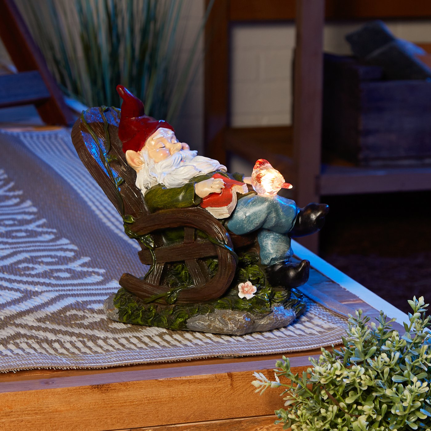 - This adorable outdoor statue features a sleepy gnome with his favorite book, taking a quick nap in his favorite rocking chair. The red bird on his knee lights up at night after soaking up the sun's rays all day.