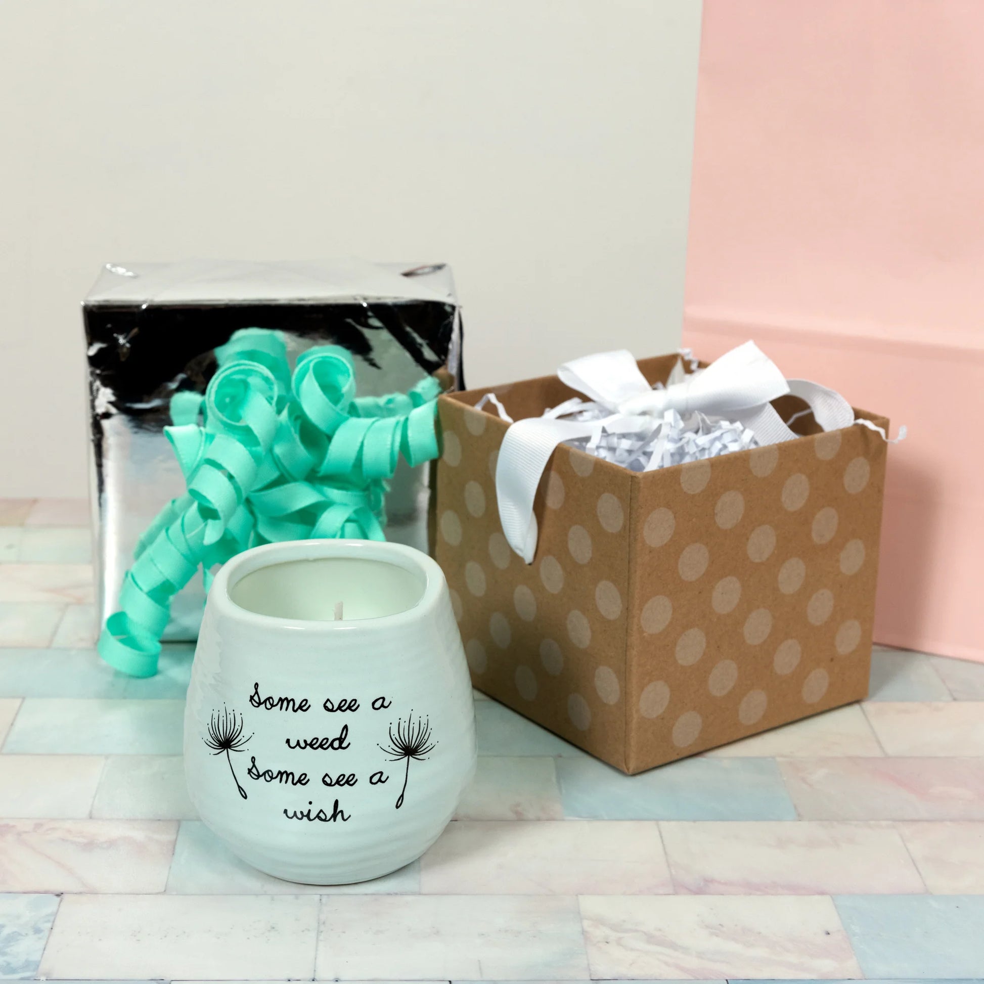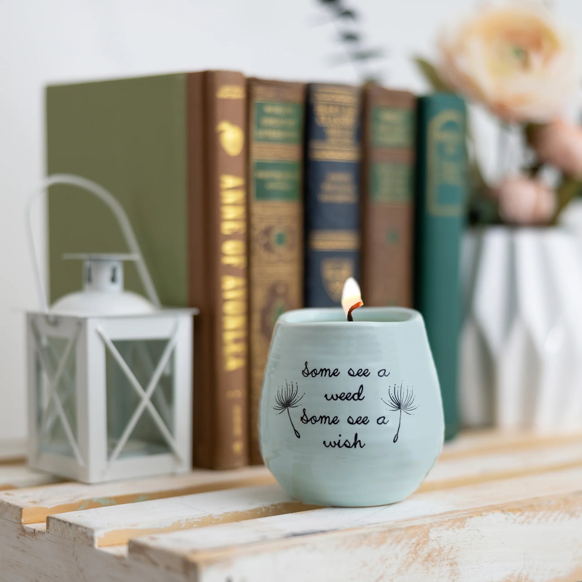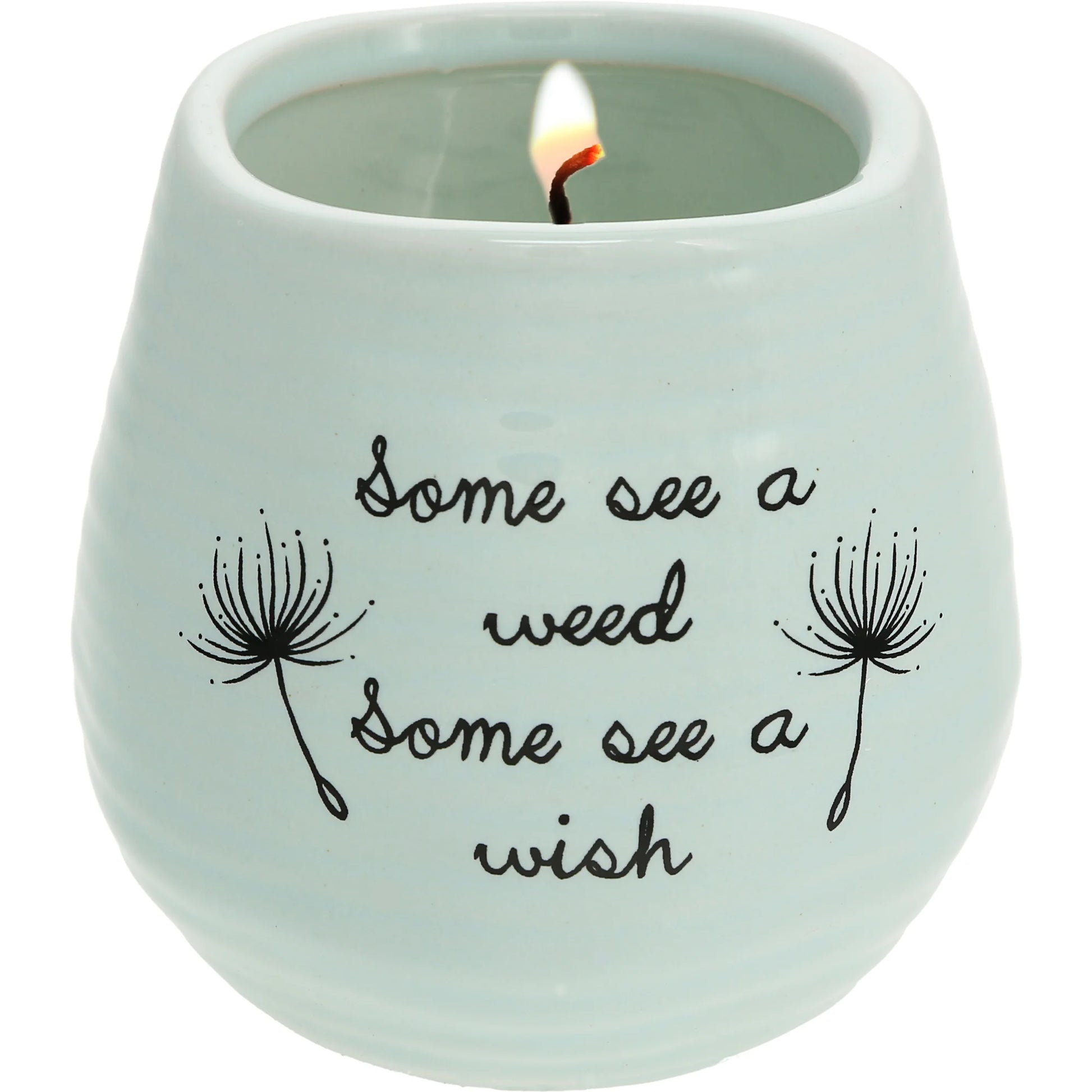 - IN-HOUSE DESIGN: "Some See A Weed; Some See A Wish" text on the front of the candle is printed, as are the accompanying dandelion details.