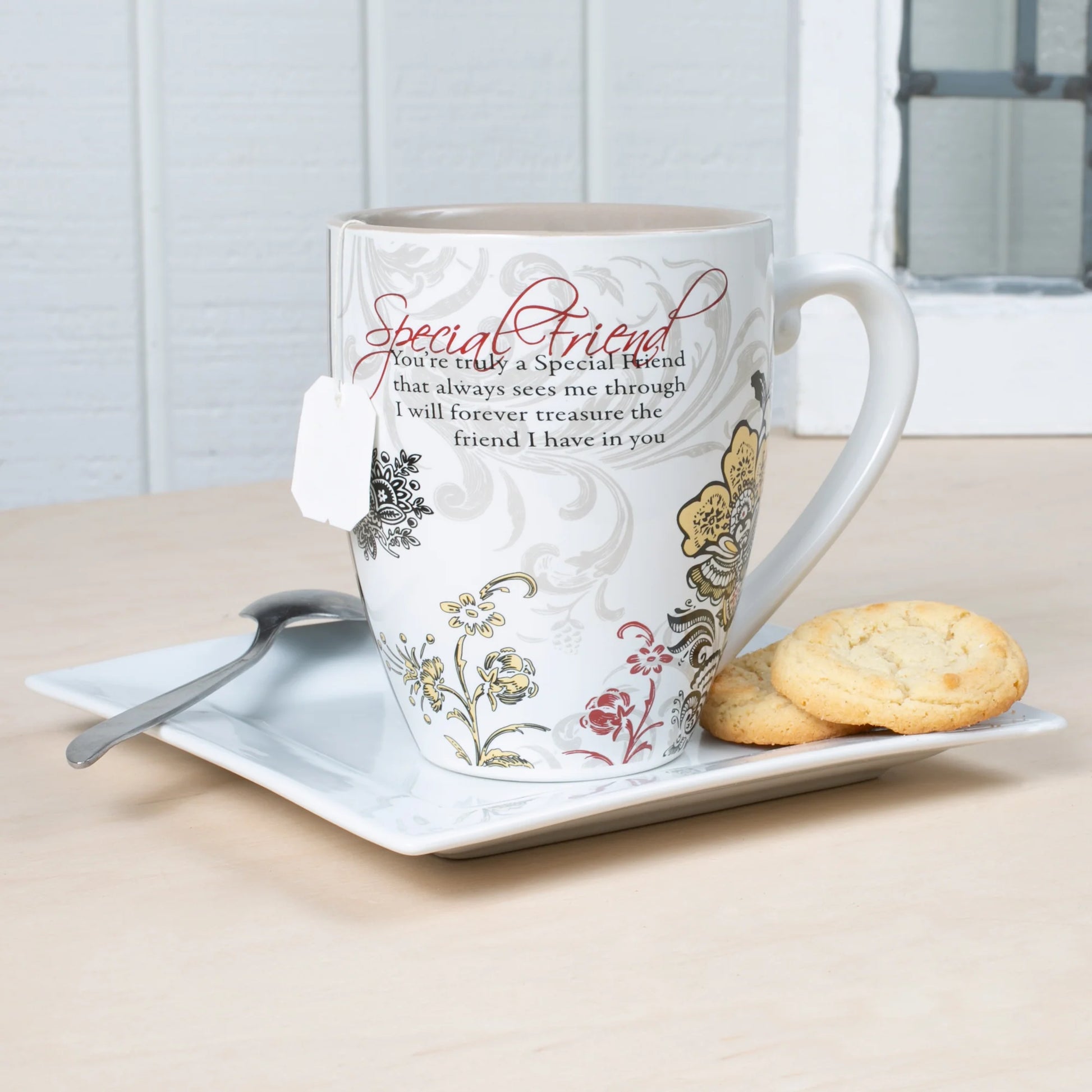 - IN-HOUSE DESIGN: Adorned with a delicate floral pattern and timeless typography, this mug features the heartfelt message, "You're truly a Special Friend that always sees me through. I will forever treasure the friend I have in you," making it a beautiful expression of friendship. The elegant script and neutral color palette allow this mug to blend seamlessly into any home décor style.