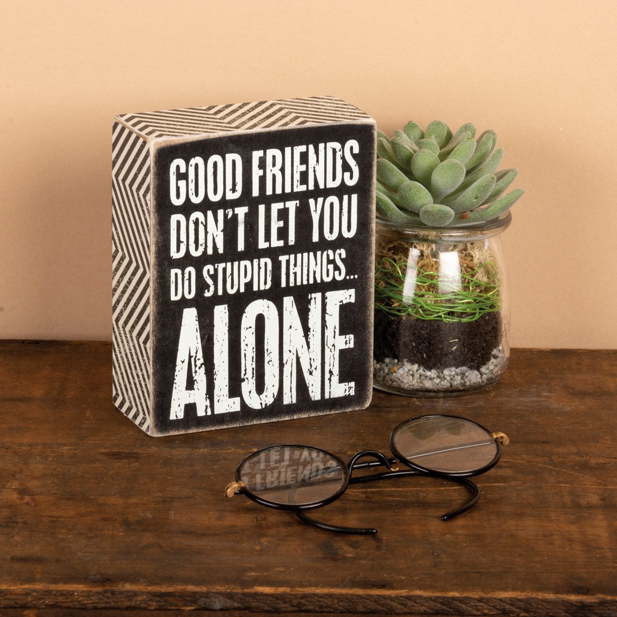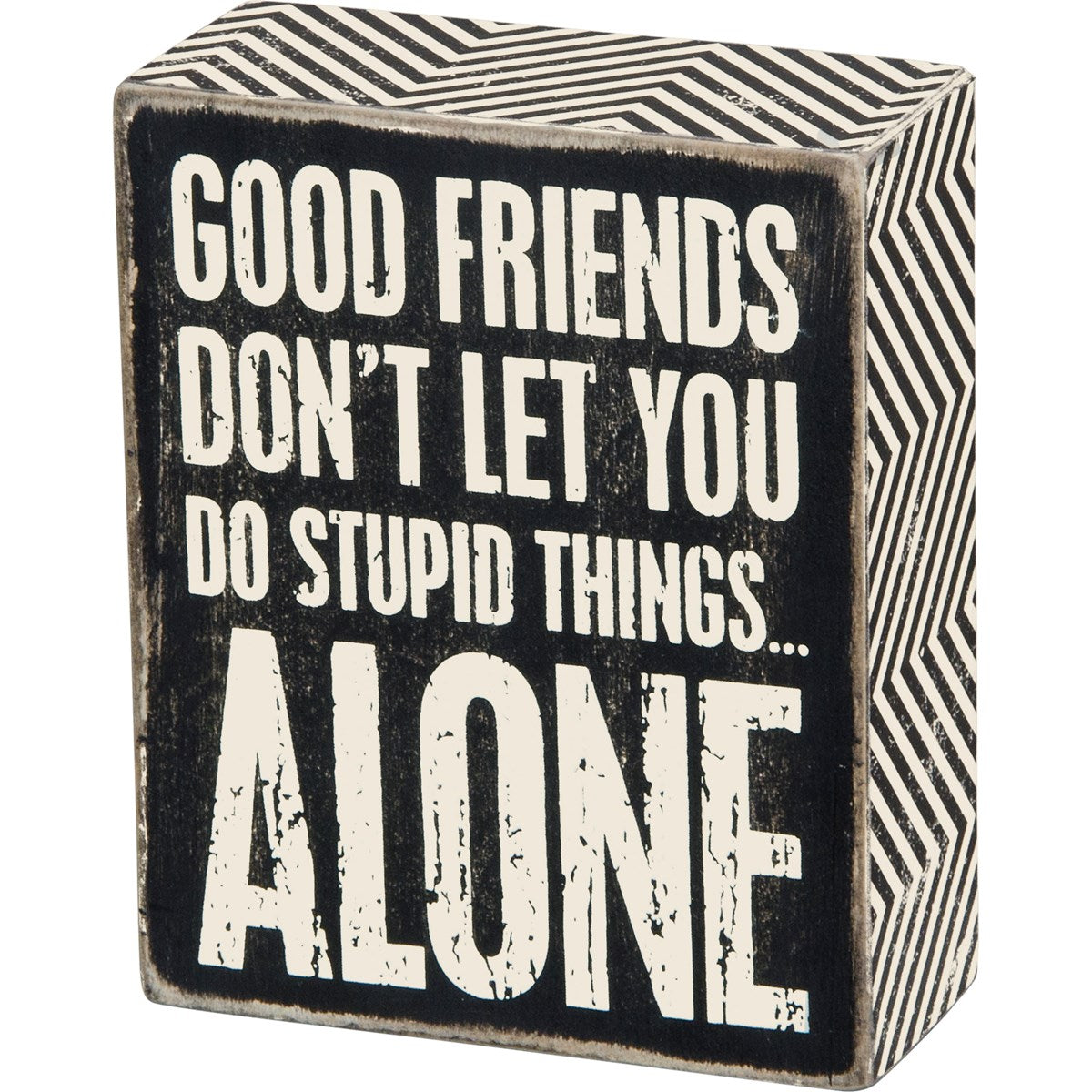 - A classic black and white wooden box sign featuring a distressed "Good Friends Don't Let You Do Stupid Things… Alone" sentiment with zigzag trim designs.